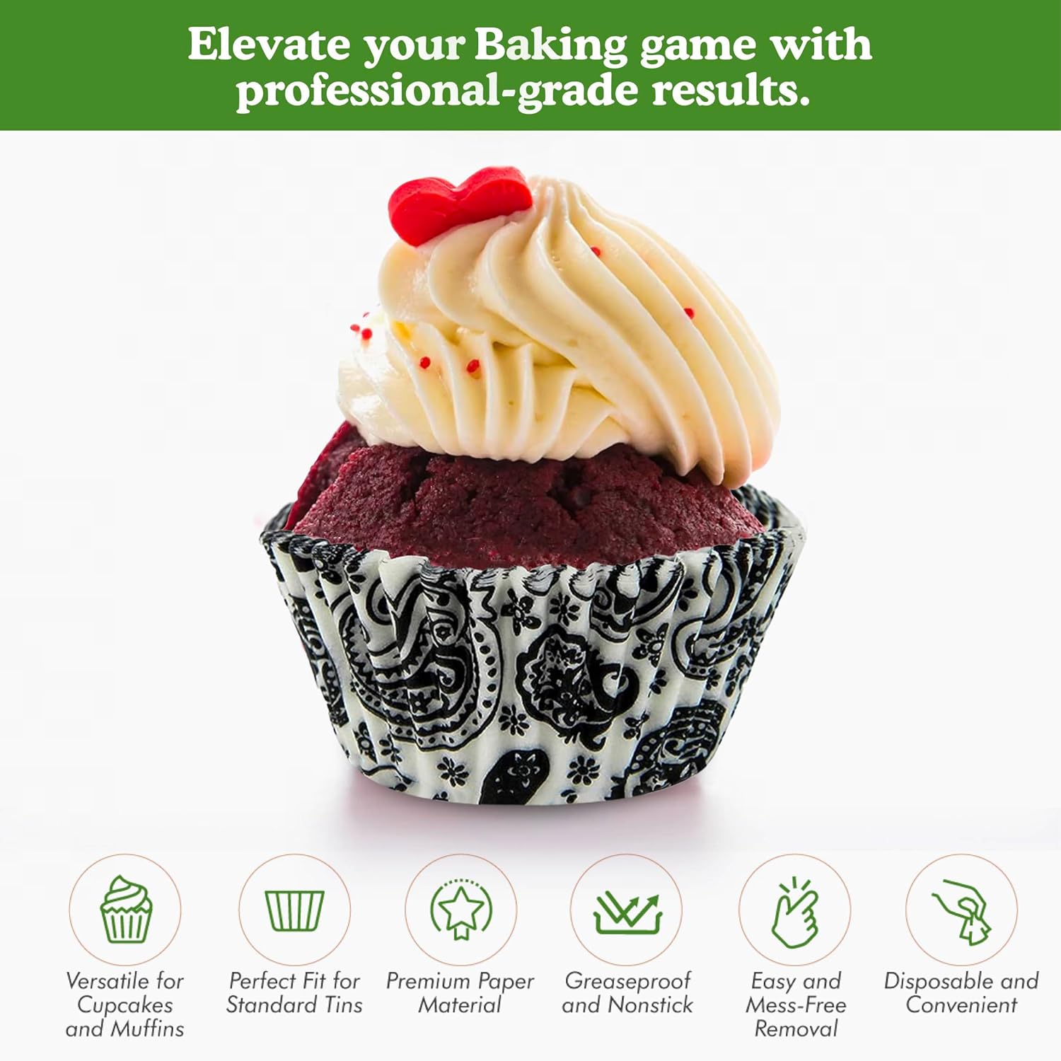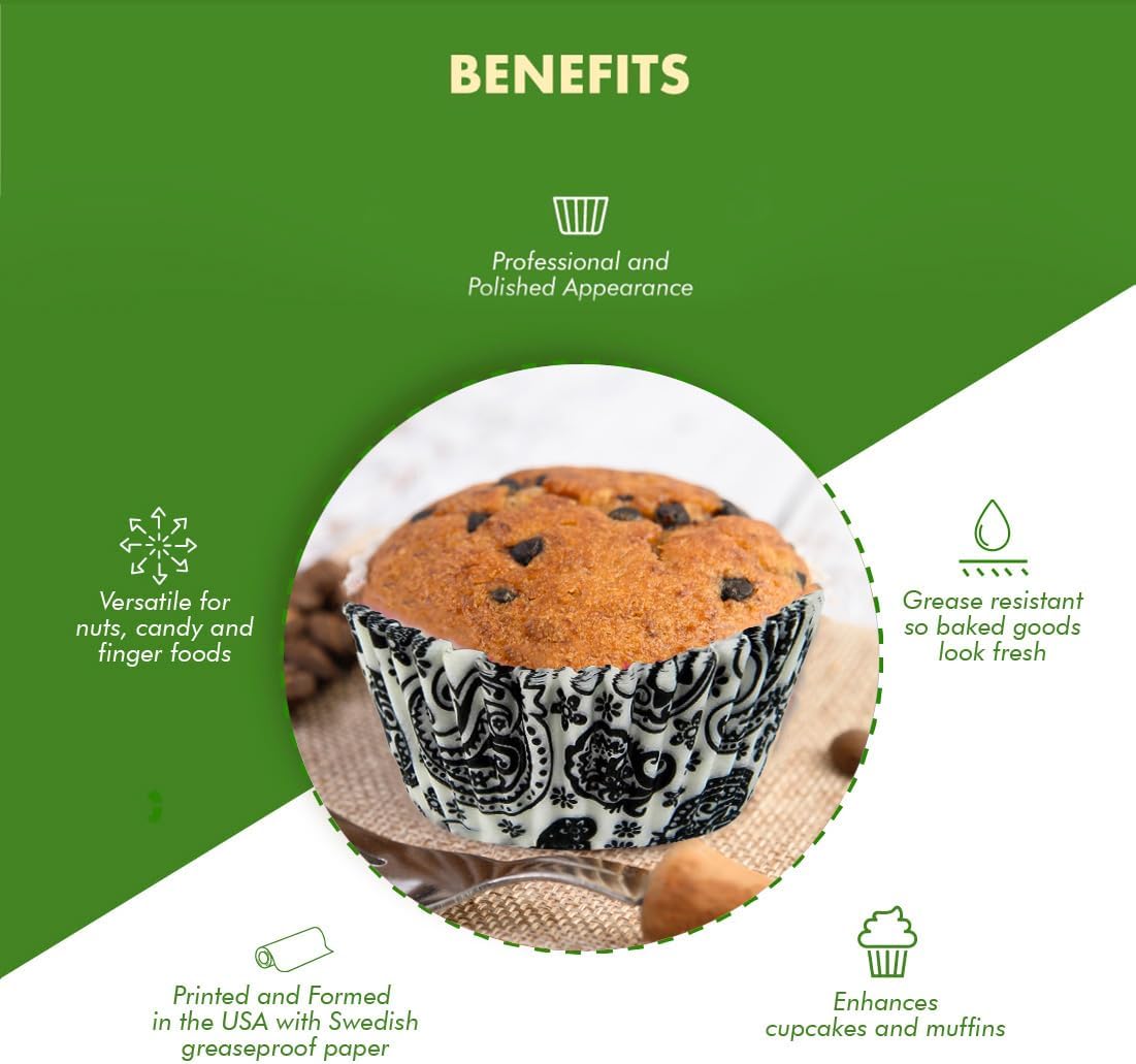 - GREASEPROOF BAKING CUPS FOR CUPCAKES & MUFFINS for nonstick baking and easy removal from pan and wrapper; Give baked goods a professional look and keep hands clean; Fits standard muffin tins, Pack of 40, Black/White Paisley