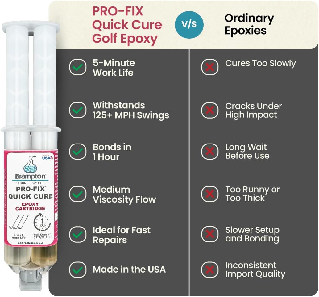 - USED BY PROS: PRO-FIX Quick Cure Golf Epoxy was designed by professional clubmakers and a chemical engineer making it unlike any other golf glue or golf epoxy on the market