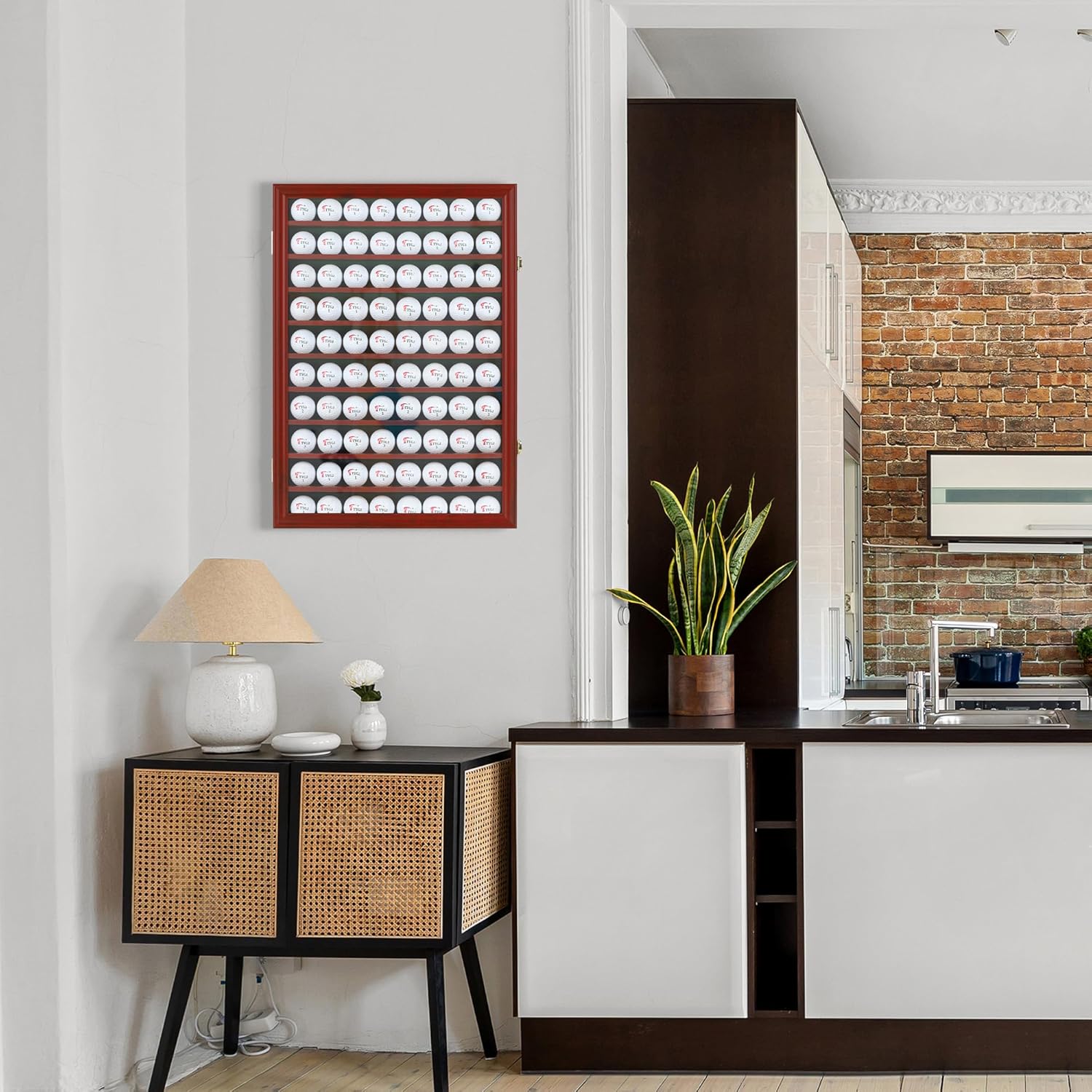 DisplayGifts 80 Golf Ball Display Case Cabinet Wall Rack Holder Solid Wood Frame with 98% UV Protection Lockable Acrylic Door, Wall Mounted or Stand Great Golfer's Gift