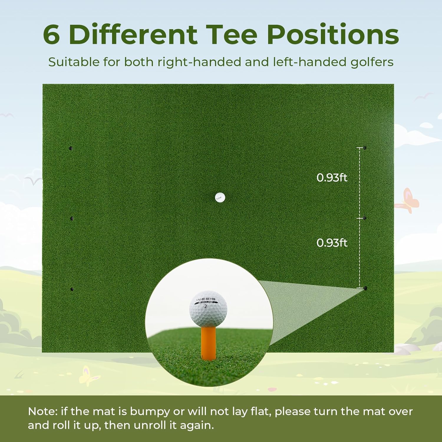 - ⛳【2 Alignment Sticks& 6 Ball Tee Positions】 The golf practice mat comes with 2 golf alignment sticks, which help straighten your golf swing. In addition, there are 6 different tee positions on the mat to meet various training needs. It is suitable for both right-handed and left-handed golfers.