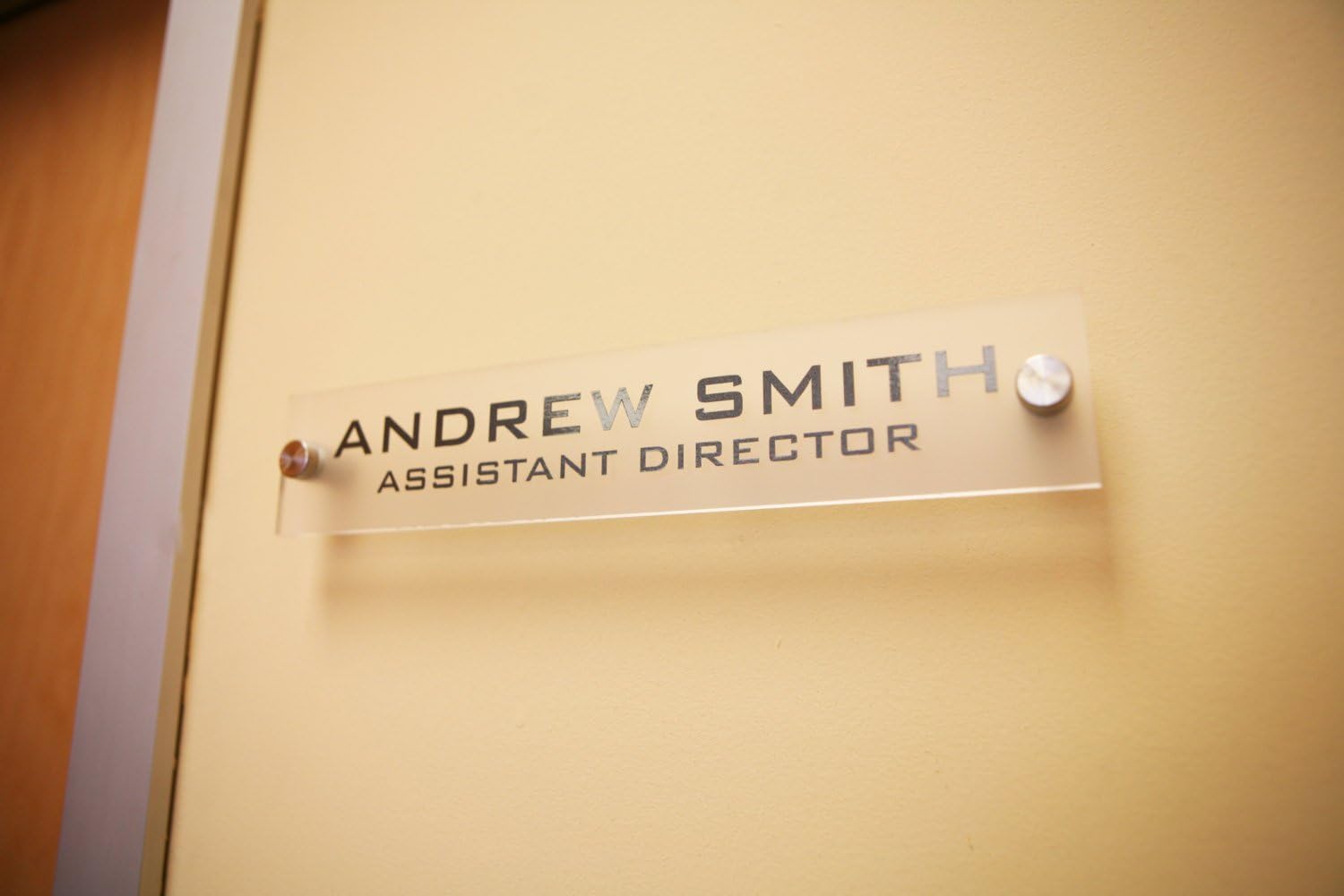 Personalized Office Wall Name Plate Sign. Modern Stainless Steel Legs (Frosted Translucent)