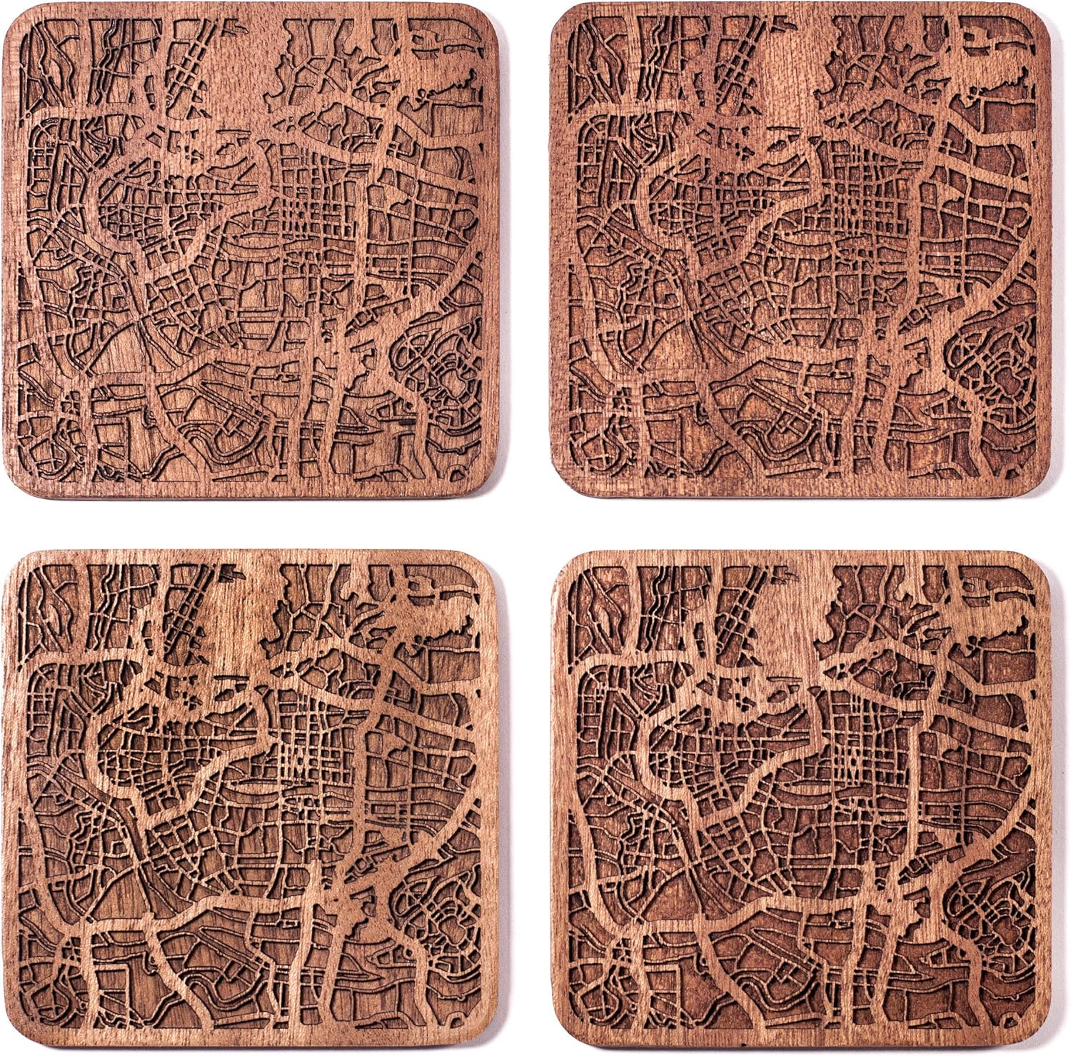 Guangzhou Map Coaster by O3 Design Studio, Set Of 4, Sapele Wooden Coaster With City Map, Handmade