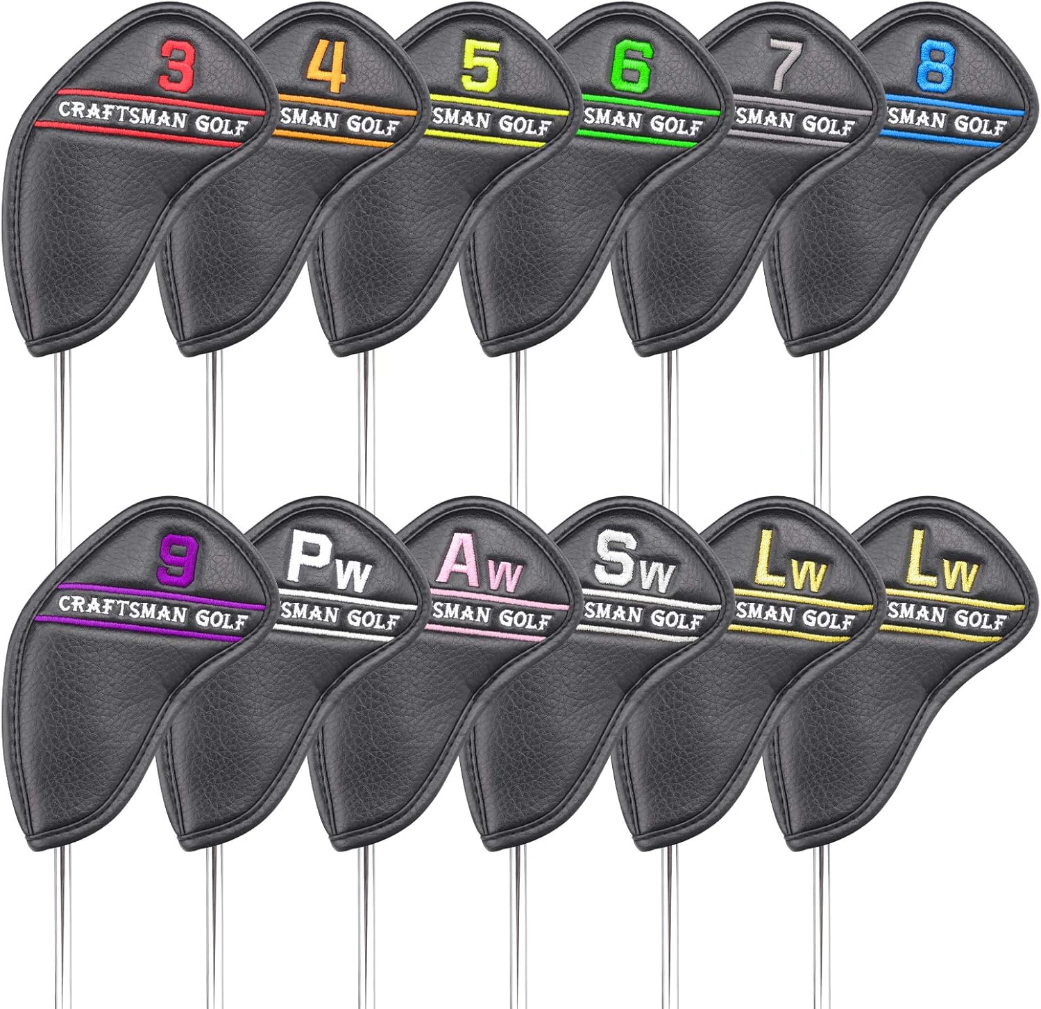CRAFTSMAN GOLF 12pcs or 1pc Black Leather Golf Iron Head Covers Set Headcover Colorful Number Embroideried for Callaway Ping Taylormade Cobra Also Custom Version w/Your Name