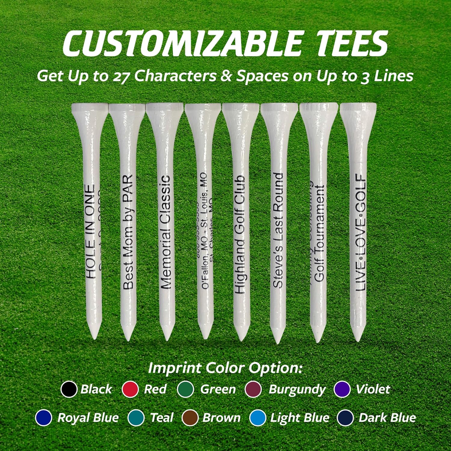 - Fun Golf Tees to Match Your Preference - Personalize the imprint of our bamboo golf tees to your liking. Every pack contains golf ball tees in White with the message imprinted in your preferred color. Our tees have ample space for your message, providing up to 27 characters and spaces on up to 3 lines each.