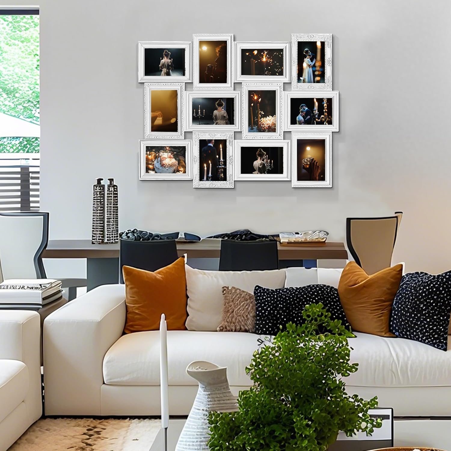 - DESIGN - Wall Decoration Frames for Living Room Photo Frames assembled with 3D staggered visual effect, there have 12 independent photo frames, can be placed 4X6 inch pictures, border width 1 inch. There are 4 independent hooks at the back for easy hanging.