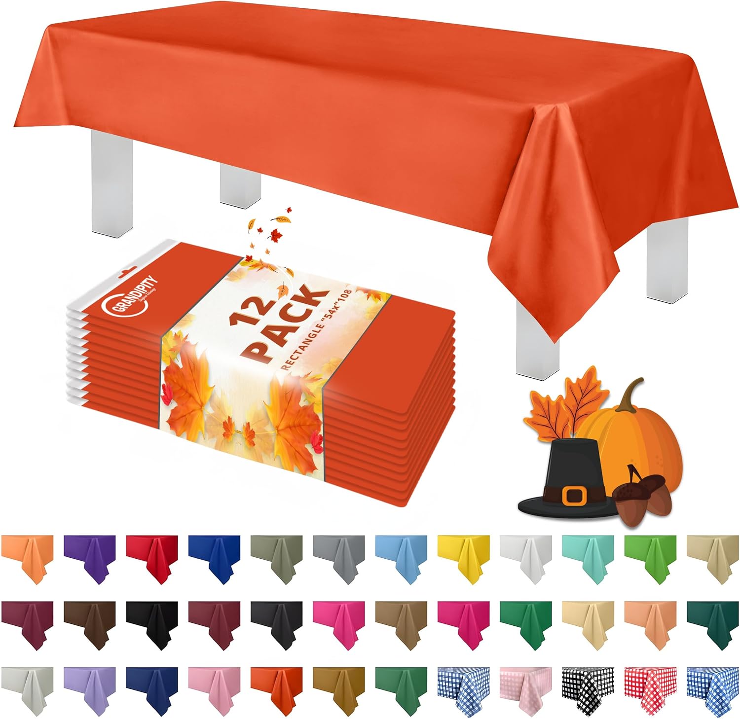 Grandipity 12 Pack Premium Disposable Plastic Tablecloth 54 Inch. x 108 Inch. Decorative Rectangle Table Cover - Orange