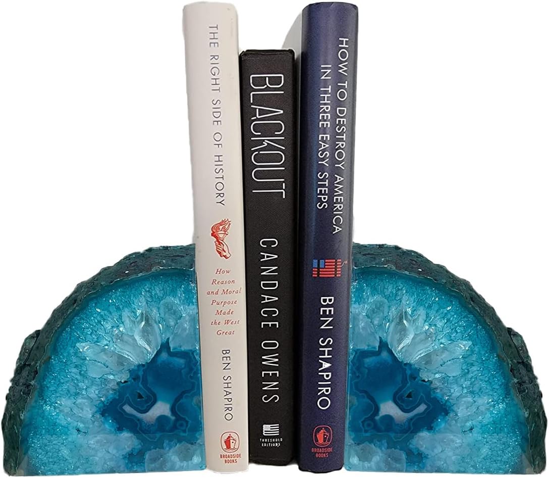 AMOYSTONE Teal Agate Bookends, Decorative Brazilian Crystal Quartz Book Stopper, 3-4 LBS with Non-Slip Mat, Perfect for Kitchen Cookbooks and Bookshelf Ends