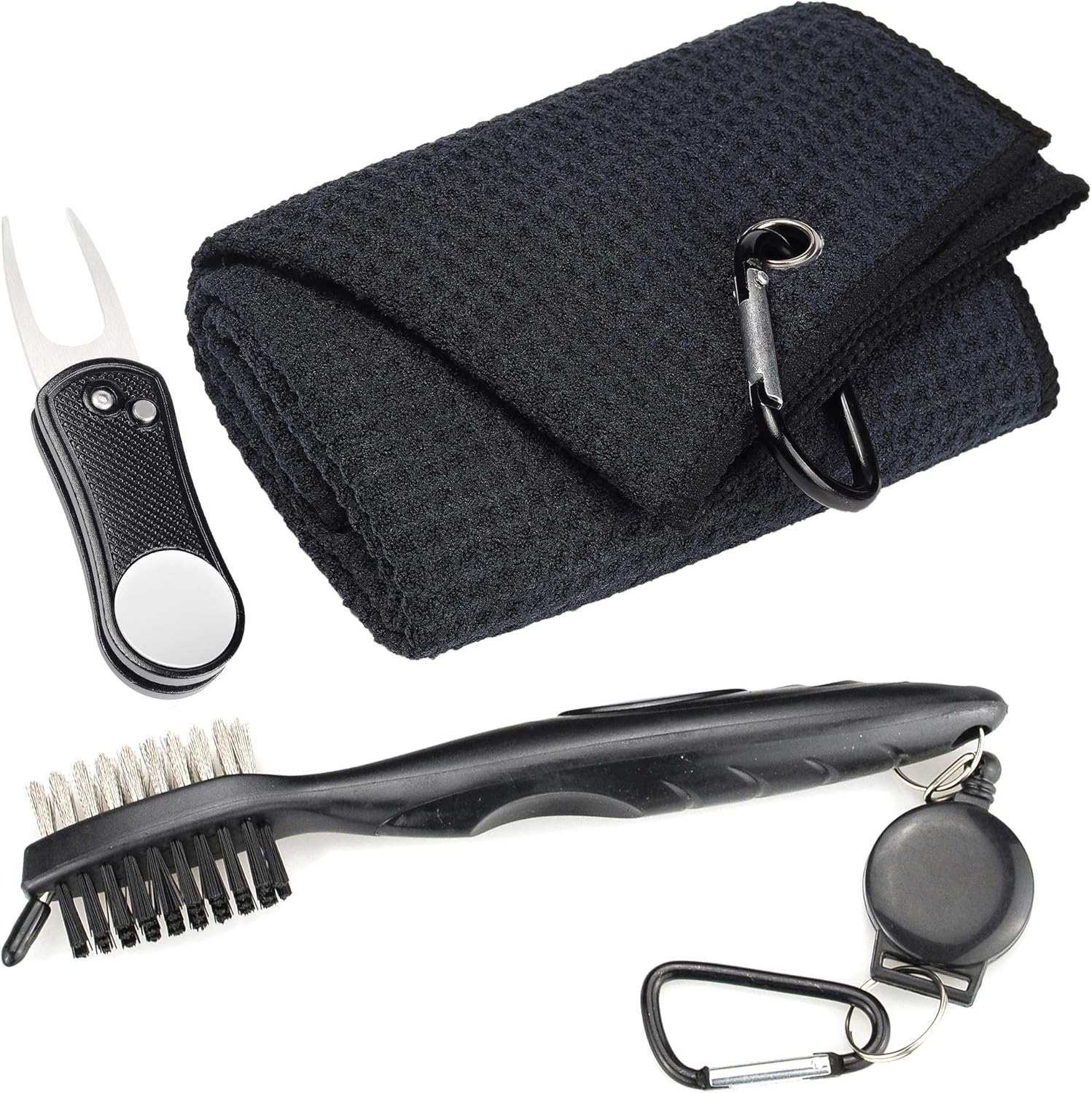 Mile High Life Microfiber Waffle Pattern Golf Towel | Club Groove Cleaner Brush | Foldable Divot Tool with Magnetic Ball Marker (Black Towel/Brush/Bone Divot)