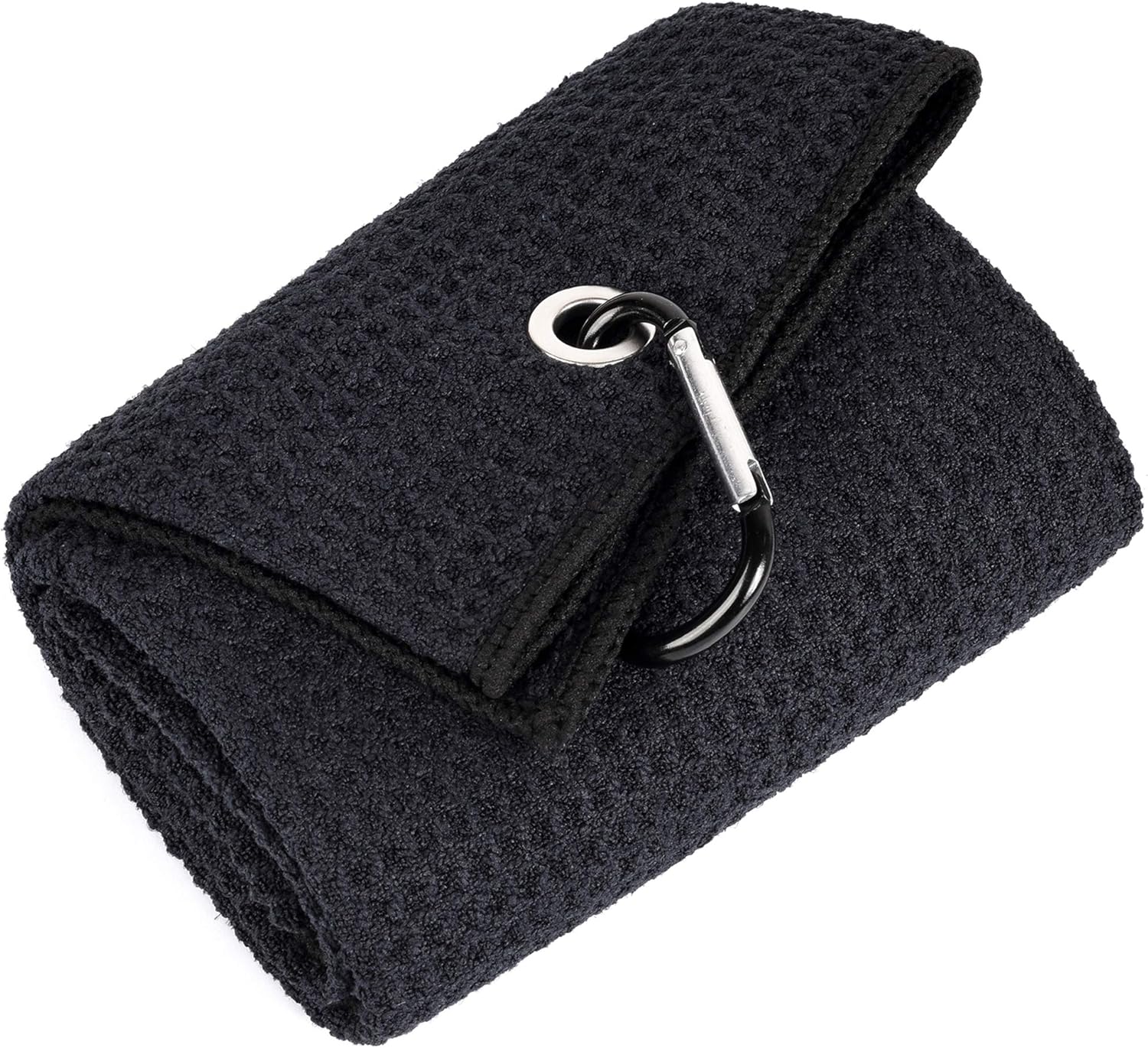 - TOWEL:Tri-fold Microfiber with waffle design removes dirt, mud, sand and grass better than cotton towels. Size 16” x 21” with a heavy duty aluminum clip/carabiner that conveniently attaches to your golf bag.