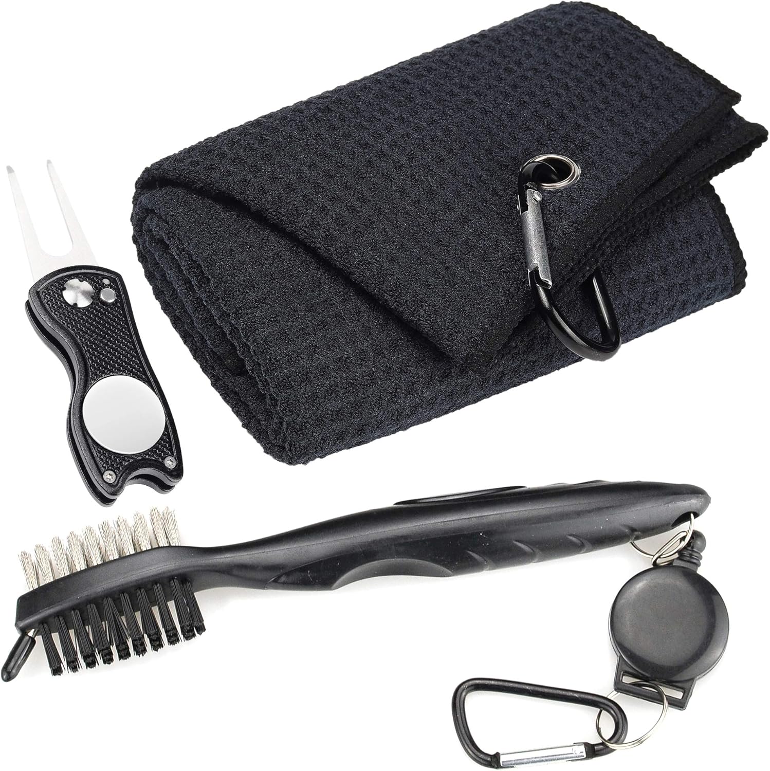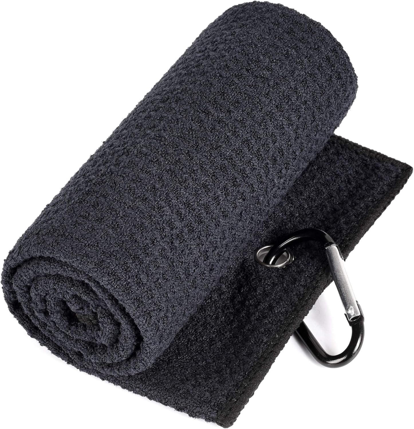 - TOWEL:Tri-fold Microfiber with waffle design removes dirt, mud, sand and grass better than cotton towels. Size 16” x 21” with a heavy duty aluminum clip/carabiner that conveniently attaches to your golf bag.