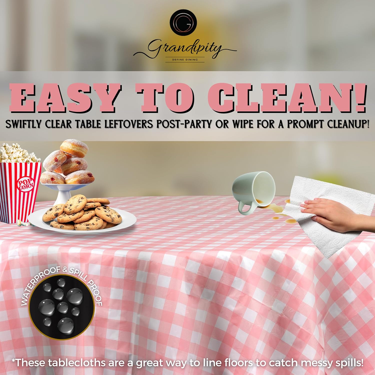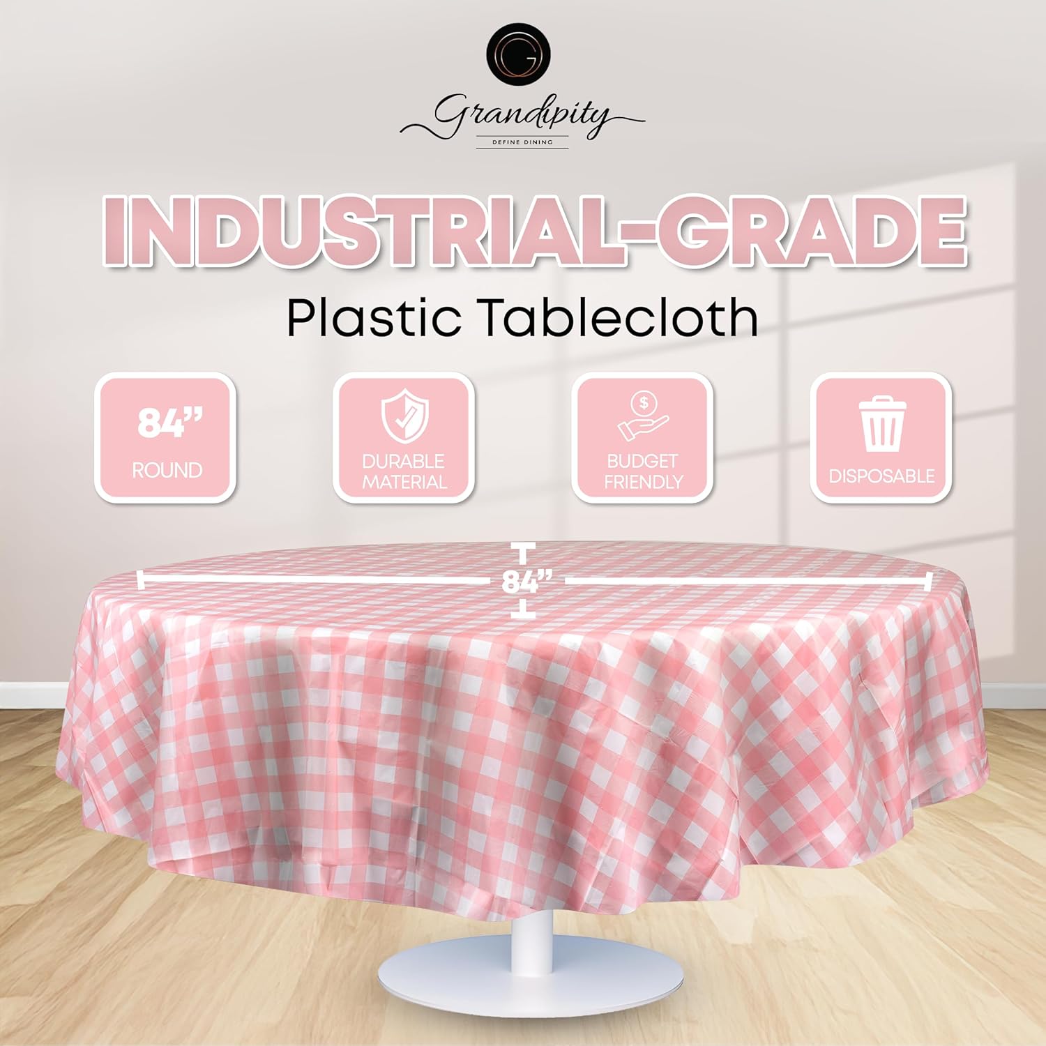 Grandipity 12 Pack Premium Disposable Plastic Tablecloth 84" Inch Decorative Round Table Cover - Pink Checkered Gingham