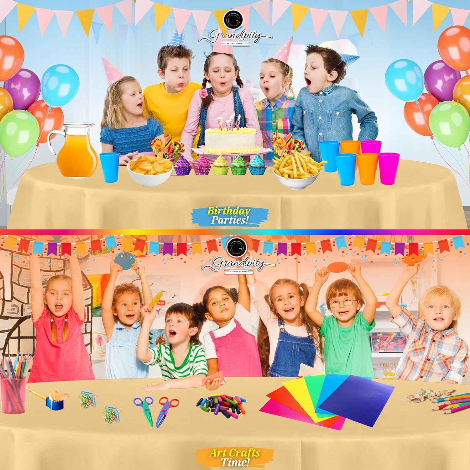 - ๐ EASY CLEAN UP: These round tablecloths are great at picking up any messy spills from food, drinks, paint from arts and crafts sessions and more! Whatโs better? Theyโre completely disposable round plastic tablecloths, so enjoy the party without the hassle of cleaning up.