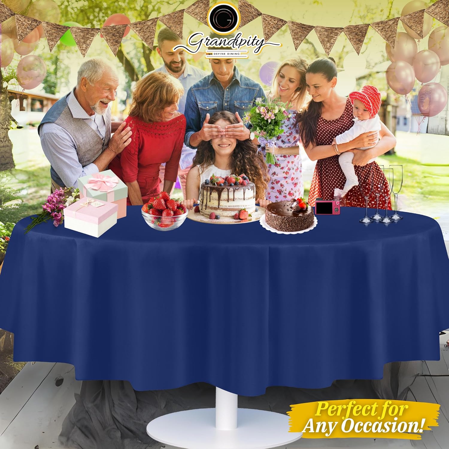 - ๐ PERFECT FIT: 84" round tablecloth disposable, covers your round table to perfection. You can also cut it to fit a smaller table. Budget Friendly. Featuring a fade and tear resistant tablecloths, our round table covers easily protect your tables and furniture from scratches, stains and sun rays. Inspires a clean sense of style at any event or meal youโre hosting with these elegant tablecloths.