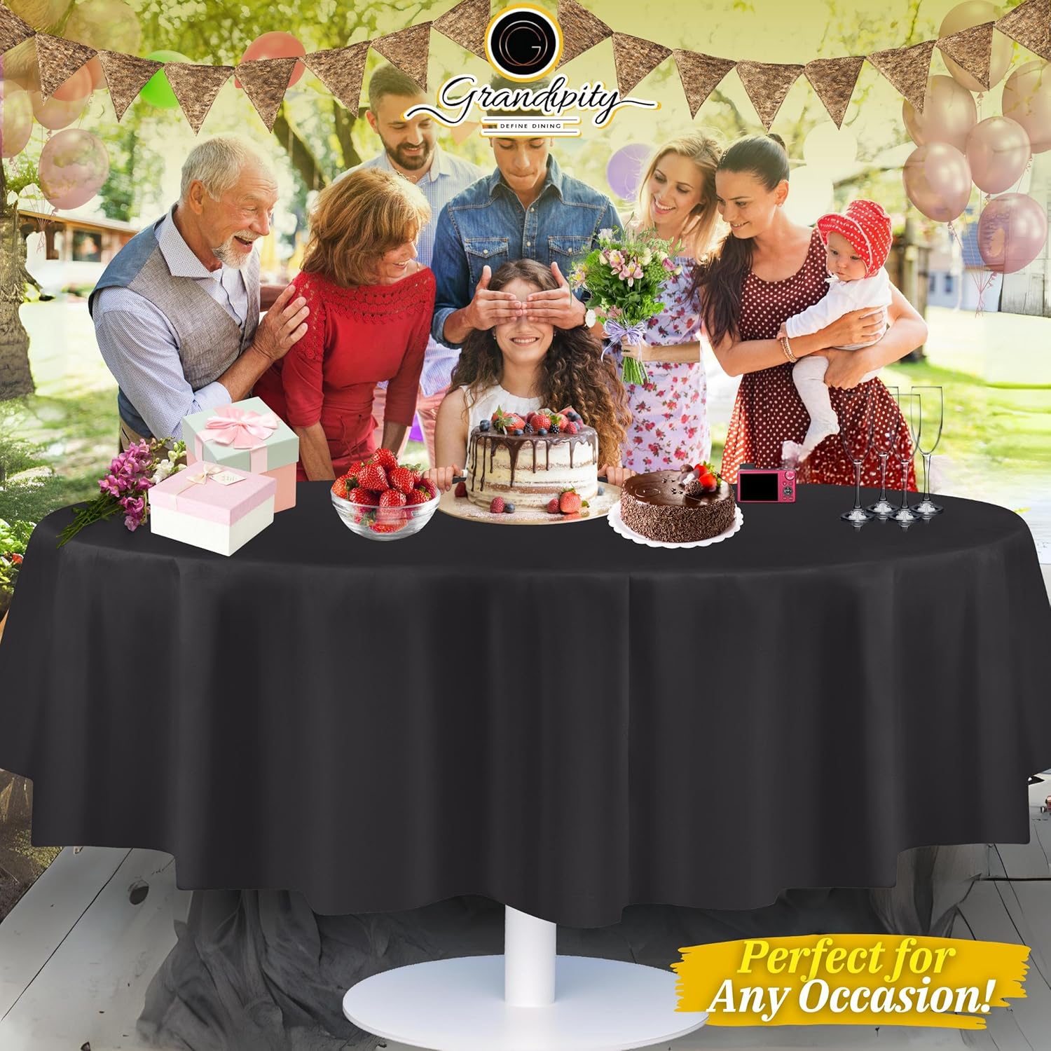 - ๐ PERFECT FIT: 84" round tablecloth disposable, covers your round table to perfection. You can also cut it to fit a smaller table. Budget Friendly. Featuring a fade and tear resistant tablecloths, our round table covers easily protect your tables and furniture from scratches, stains and sun rays. Inspires a clean sense of style at any event or meal youโre hosting with these elegant tablecloths.
