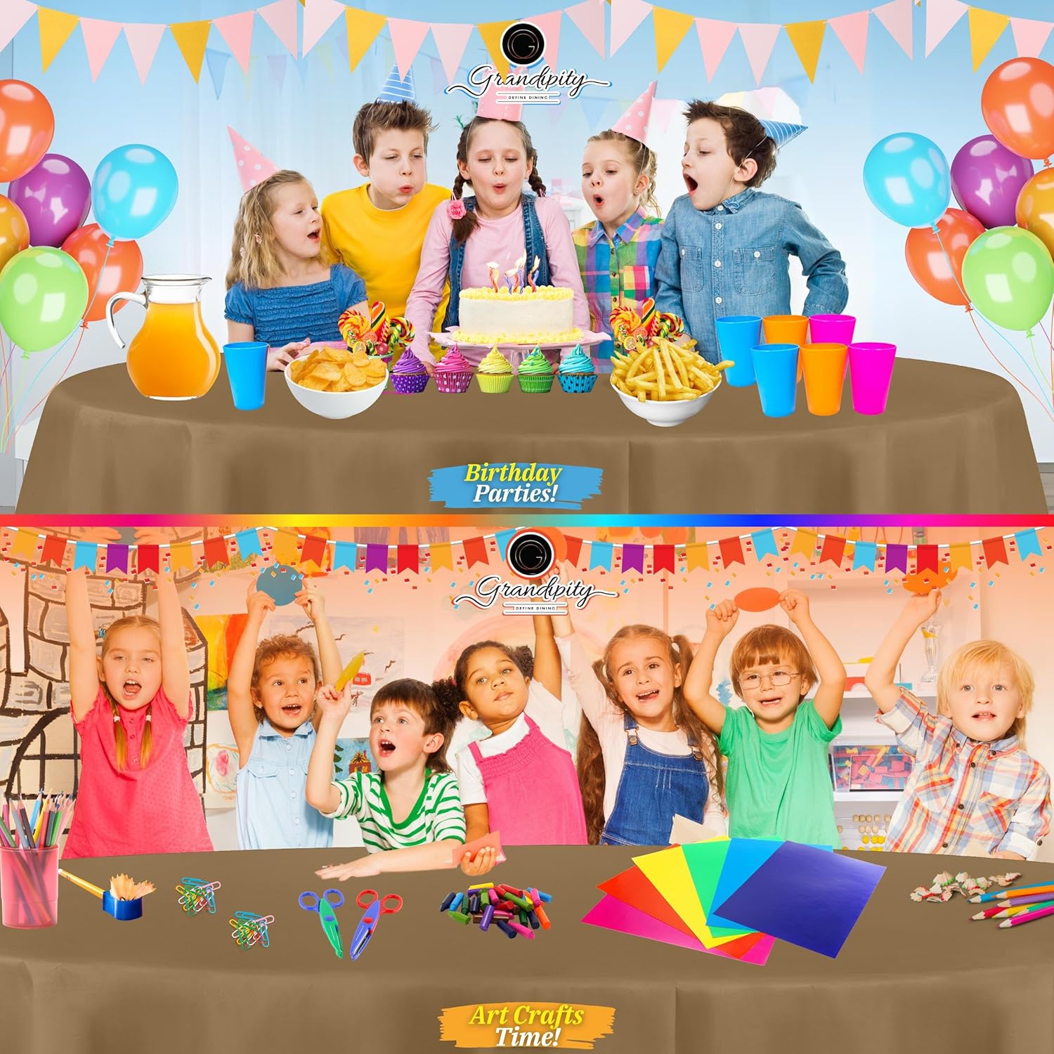 - ๐ EASY CLEAN UP: These round tablecloths are great at picking up any messy spills from food, drinks, paint from arts and crafts sessions and more! Whatโs better? Theyโre completely disposable round plastic tablecloths, so enjoy the party without the hassle of cleaning up.