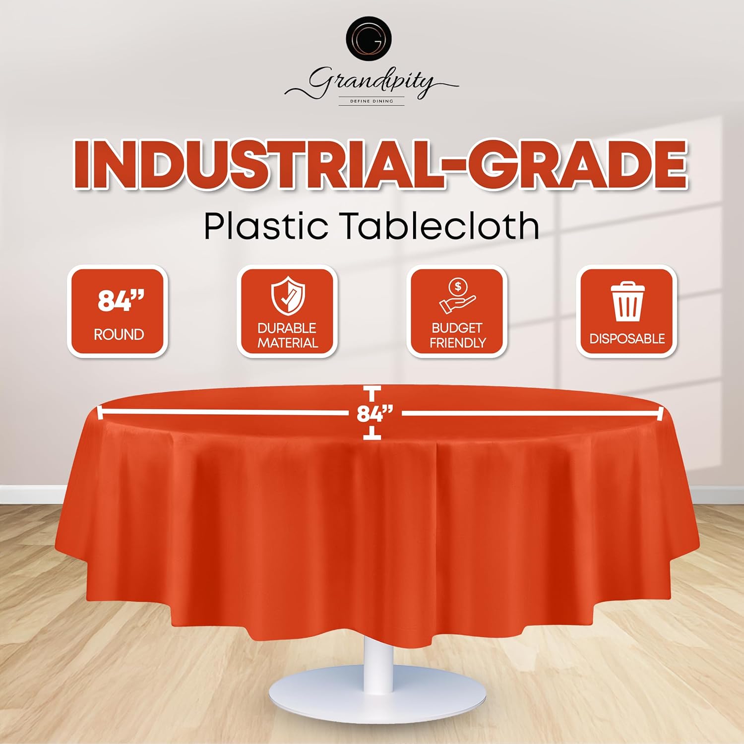 Grandipity 12 Pack Premium Disposable Plastic Tablecloth 84" Inch Decorative Round Table Cover - Orange