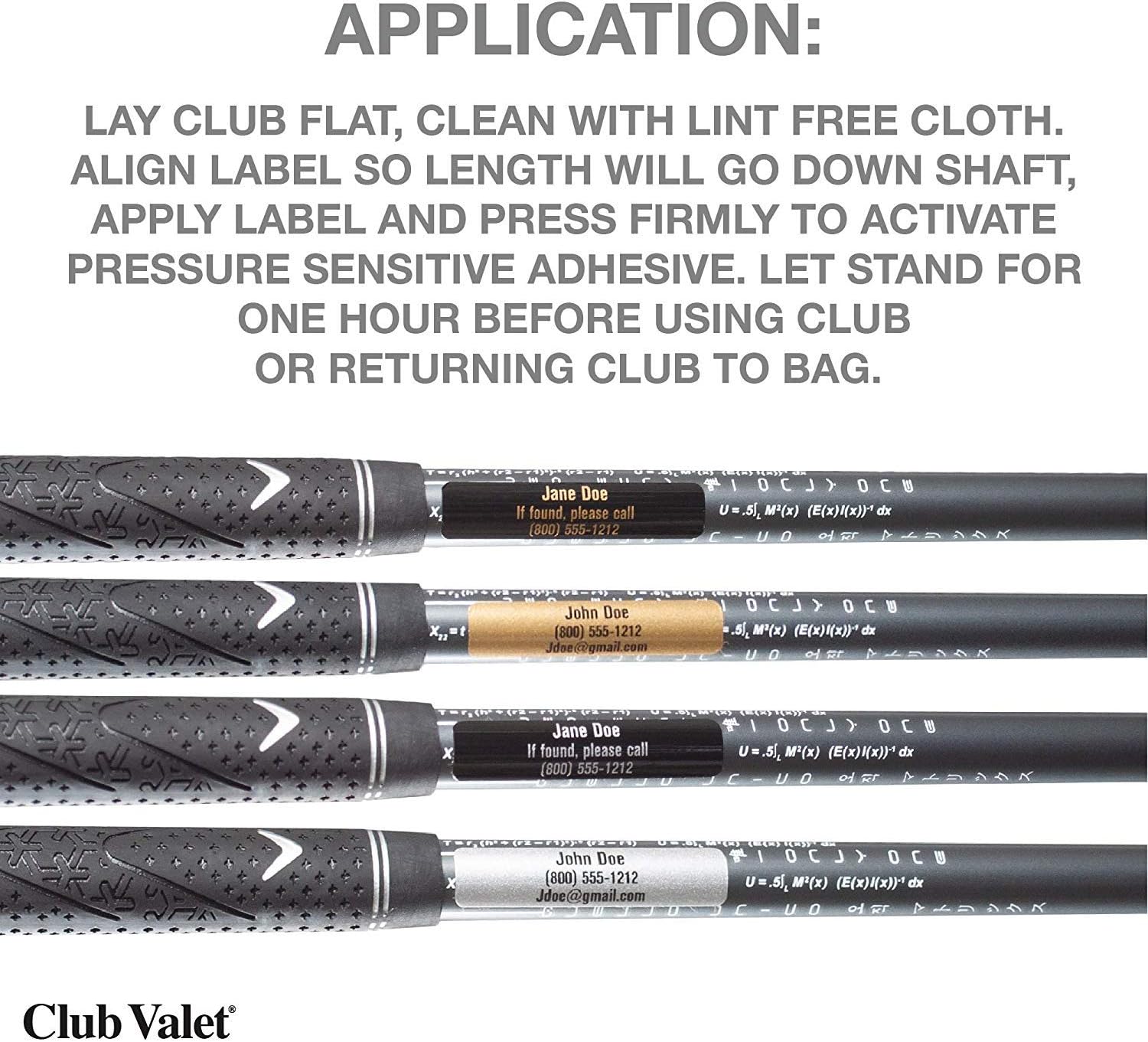 - Free Customized Content: Print up to 3 lines on our classy golf shaft labels. Each sticker label is printed with bold, clear, concise script to identify who the item belongs to and how to contact you. Print up to 90 characters on your customized labels for golf club ID, racquet, tools, sunglasses, and more.