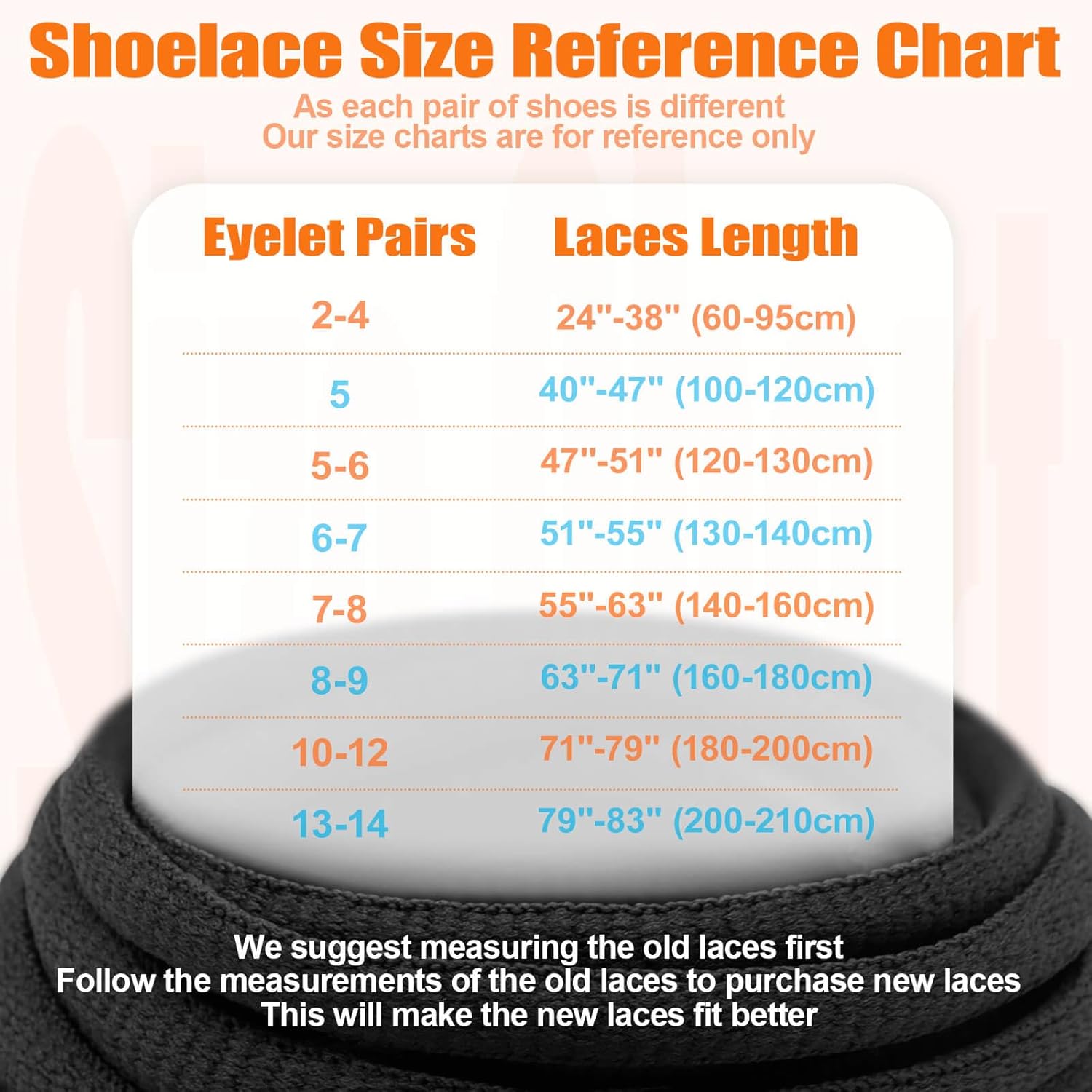 - [Steps to Use] Take off the shoelace that is now on it and measure the length from tip to tip. This is the required length. If your previous laces are too short or too long, add or subtract from your laces. Attention: the length of 60 cm - 95 cm is more suitable for shoes with less than 4 holes; For shoelaces over 100 cm in length, we recommend shoes with 5 or more holes