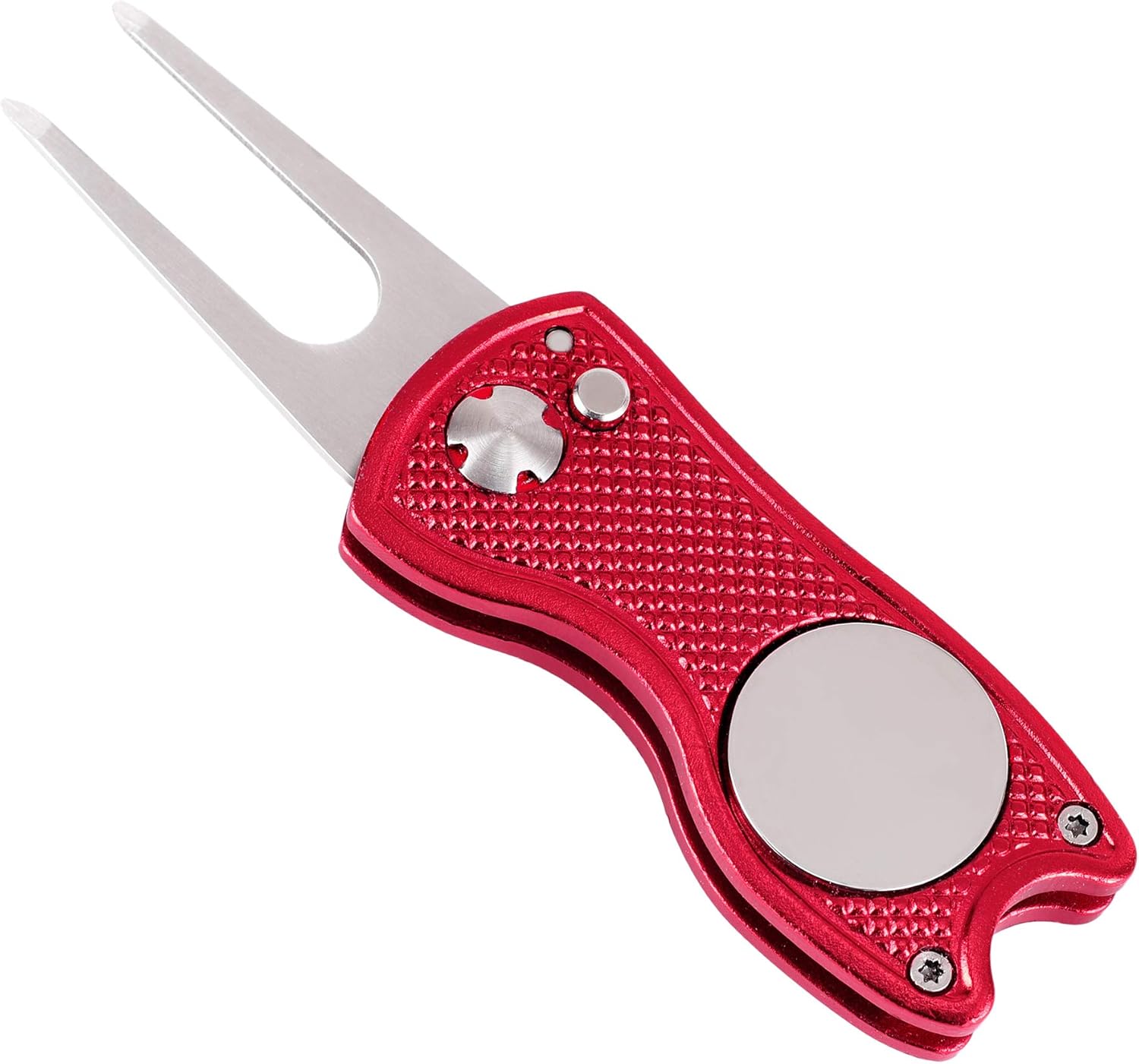 - FOLDABLE DIVOT TOOL: Dimension 2 3/4 inch x 1 1/4 inch x 1/2 inch, avoid scratch in the pocket, Pop down button for easy unfolding. Full Metal with magnetic ball marker that attaches to the divot tool, easy push down to pop and reseat. Solid grip and feel.