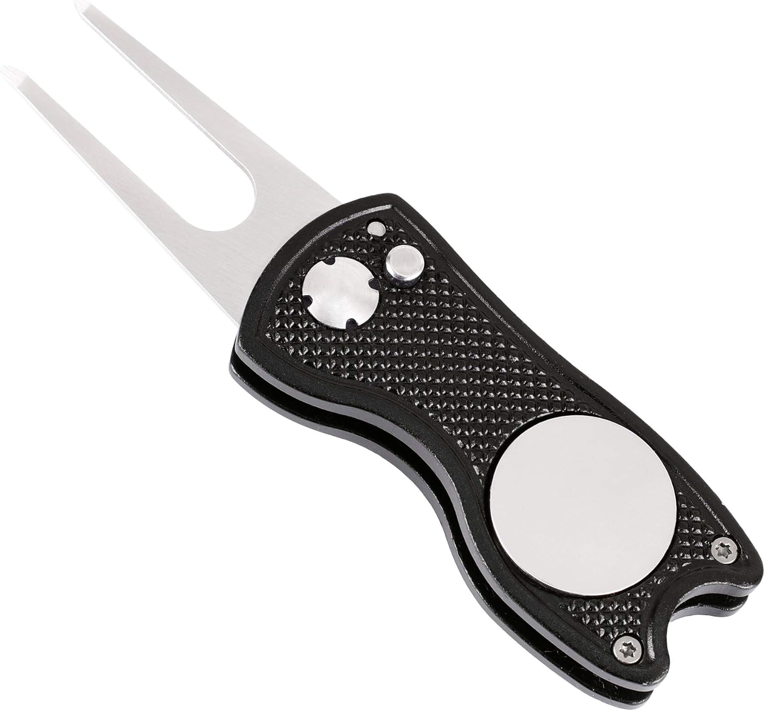 - FOLDABLE DIVOT TOOL: Dimension 2 3/4 inch x 1 1/4 inch x 1/2 inch, avoid scratch in the pocket, Pop down button for easy unfolding. Full Metal with magnetic ball marker that attaches to the divot tool, easy push down to pop and reseat. Solid grip and feel.