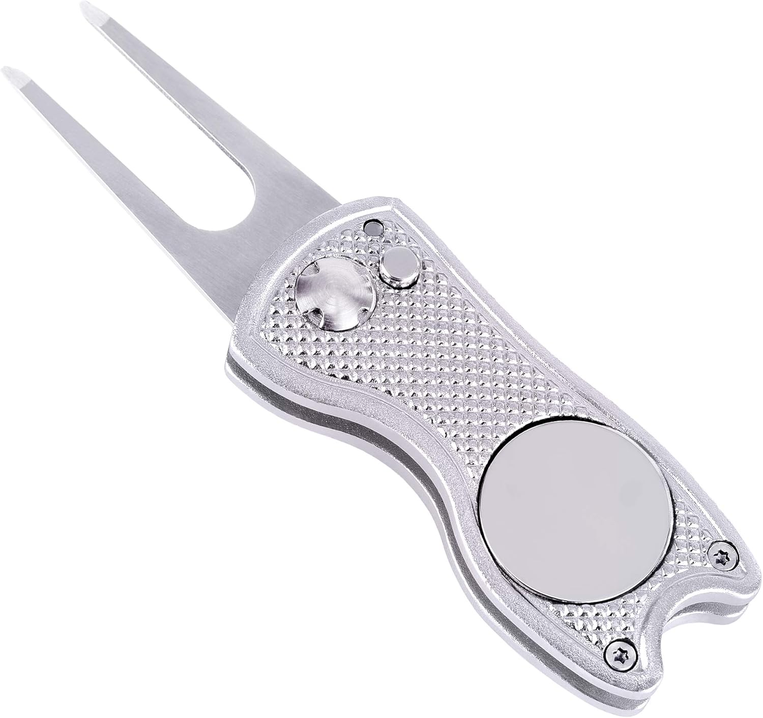 - FOLDABLE DIVOT TOOL: Dimension 2 3/4 inch x 1 1/4 inch x 1/2 inch, avoid scratch in the pocket, Pop down button for easy unfolding. Full Metal with magnetic ball marker that attaches to the divot tool, easy push down to pop and reseat. Solid grip and feel.