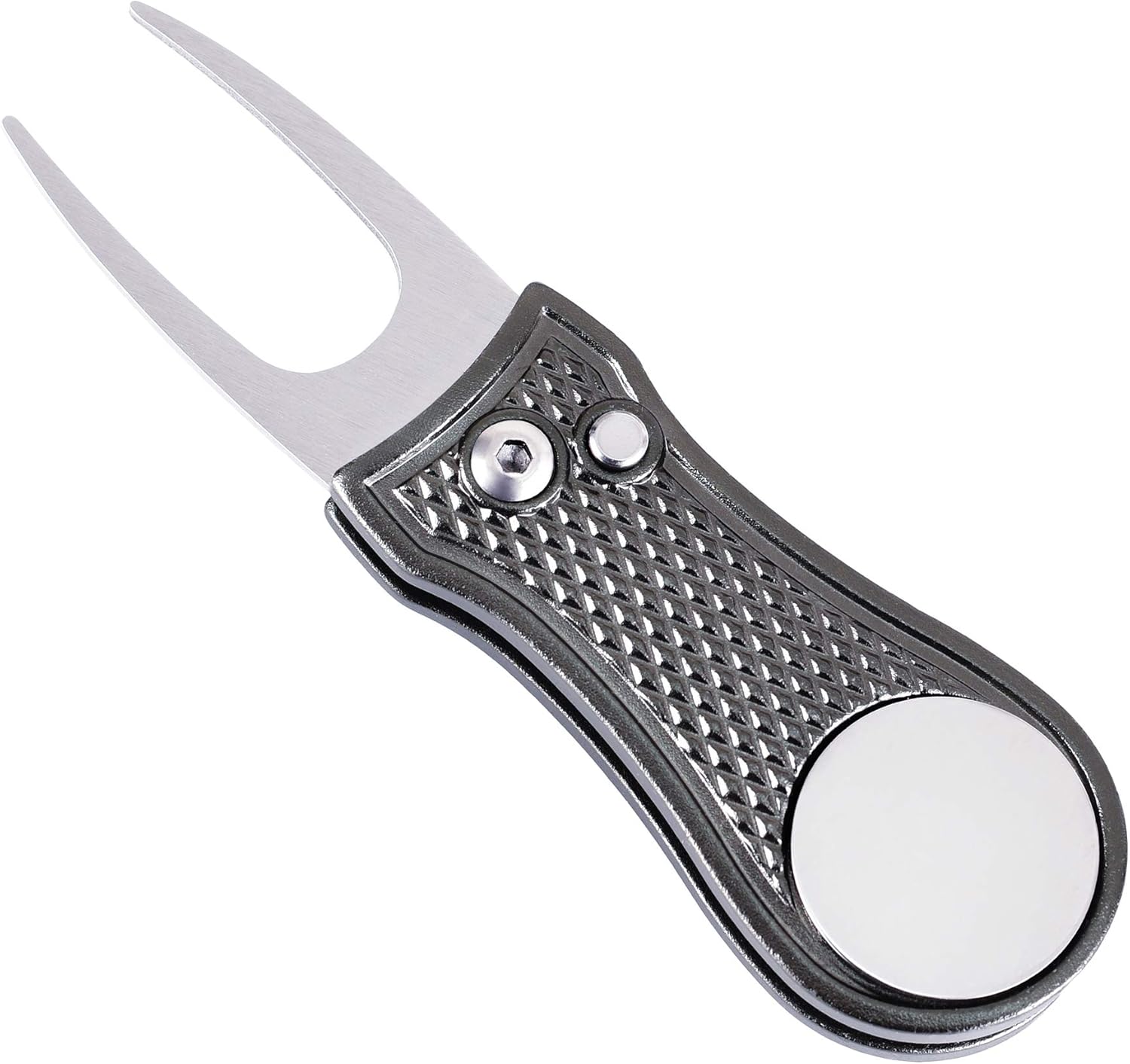 - FOLDABLE DIVOT TOOL: Dimension 2 3/4 inch x 1 1/4 inch x 1/2 inch, avoid scratch in the pocket, Pop down button for easy unfolding. Full Metal with magnetic ball marker that attaches to the divot tool, easy push down to pop and reseat. Solid grip and feel.