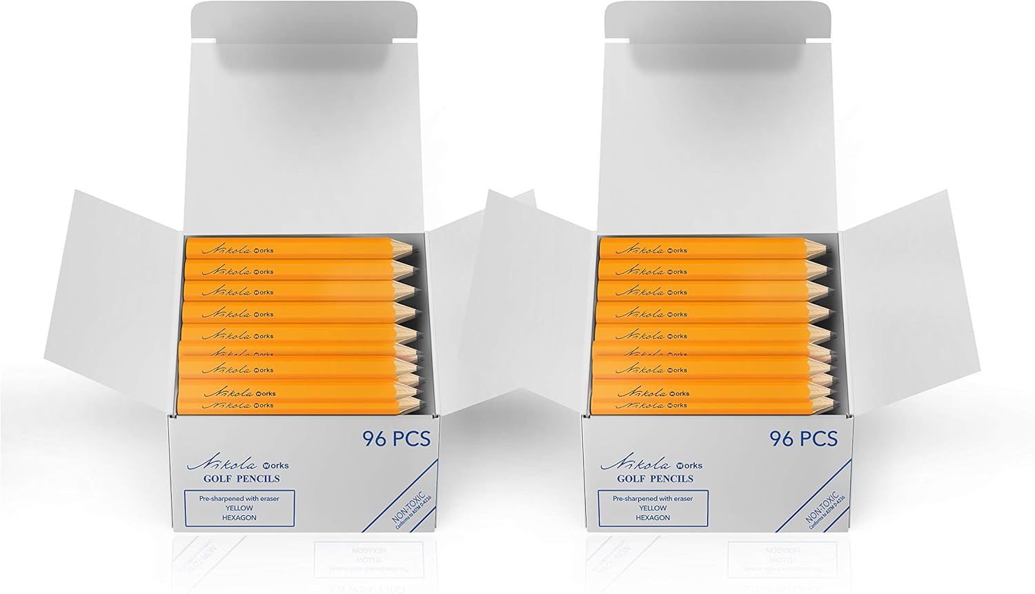- Each Box is Packed With 96 Premium Miniature #2 Pencils. Each Pencil is Made From High-Quality Wood for Clean Easy Sharpening, But They Are Already Presharpened So There's No Need To Sharpen, You Can Just Toss One In Your Shirt Pocket and Hit The Golf Course.