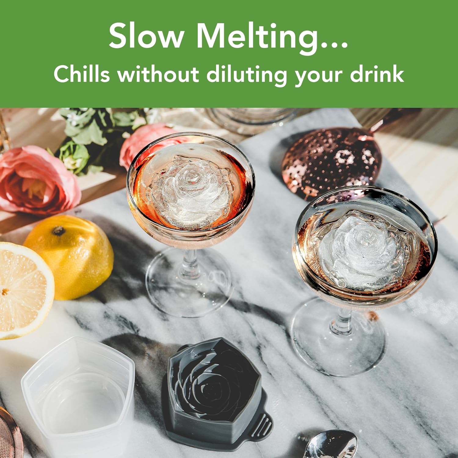 - SLOW MELTING ROSE ICE CUBES: Create beautiful rose ice cubes that melt slowly to chill cocktails mimosas and beverages without diluting the flavor while adding elegant rose shaped ice to elevate your drinks