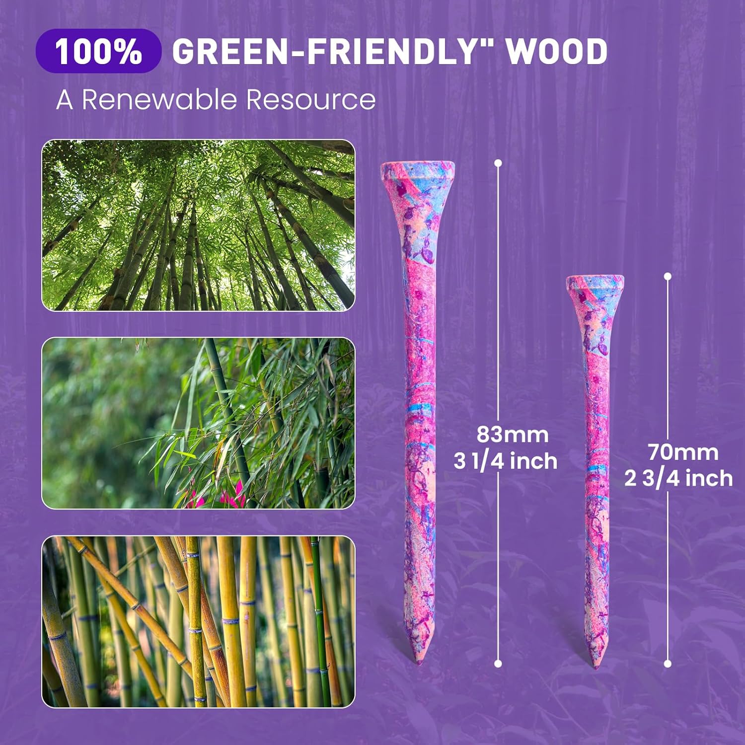 Amy Sport Golf Tees Styllish Bamboo Wooden Coloured Painted Bulk 200 Pack 1 1/2 3 1/4 2 3/4 Inch Tee, Enhanced Visibility Color Purple Pink Green Blue, Practice for Men Women