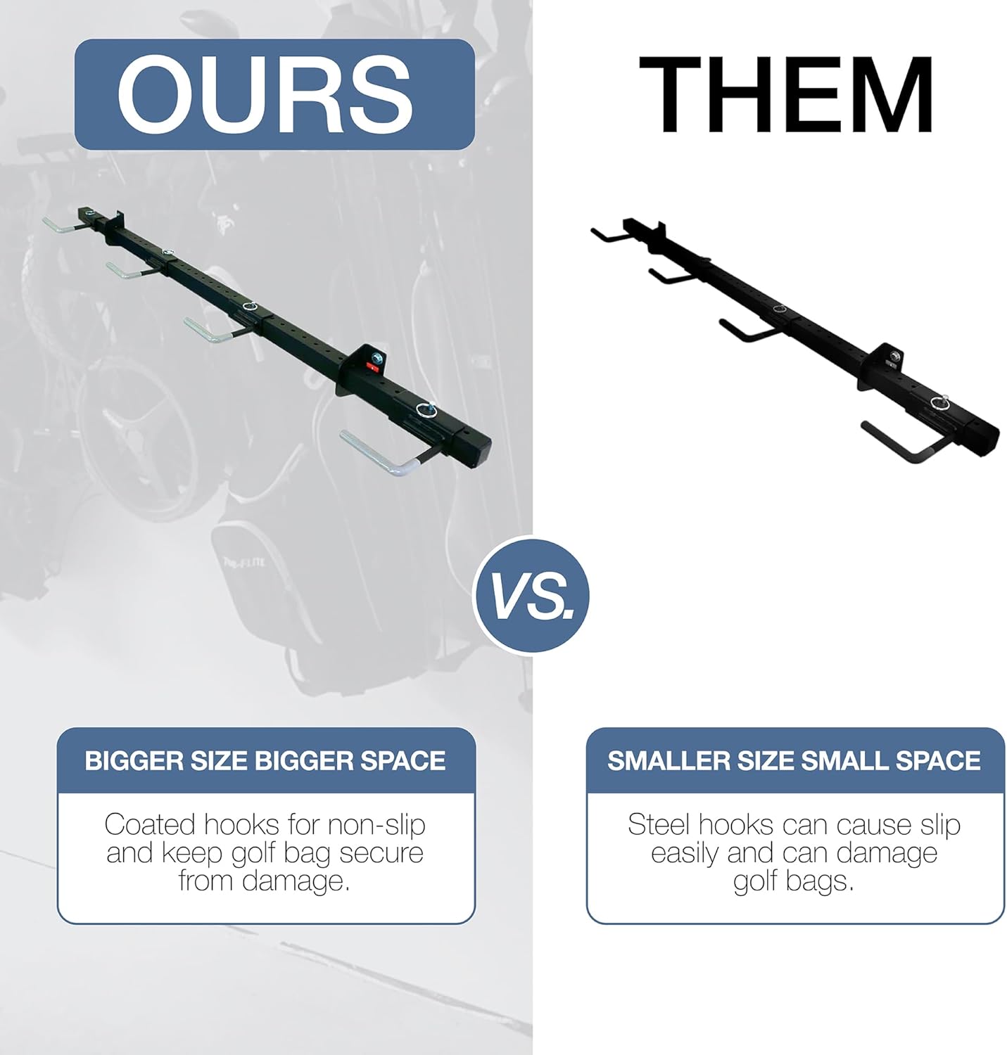 - Adjustable Wall Storage – Customize your setup with adjustable mounting bars. This golf bag wall mount is the ultimate space-saving solution for organizing your golf gear in the garage, home, or shed.