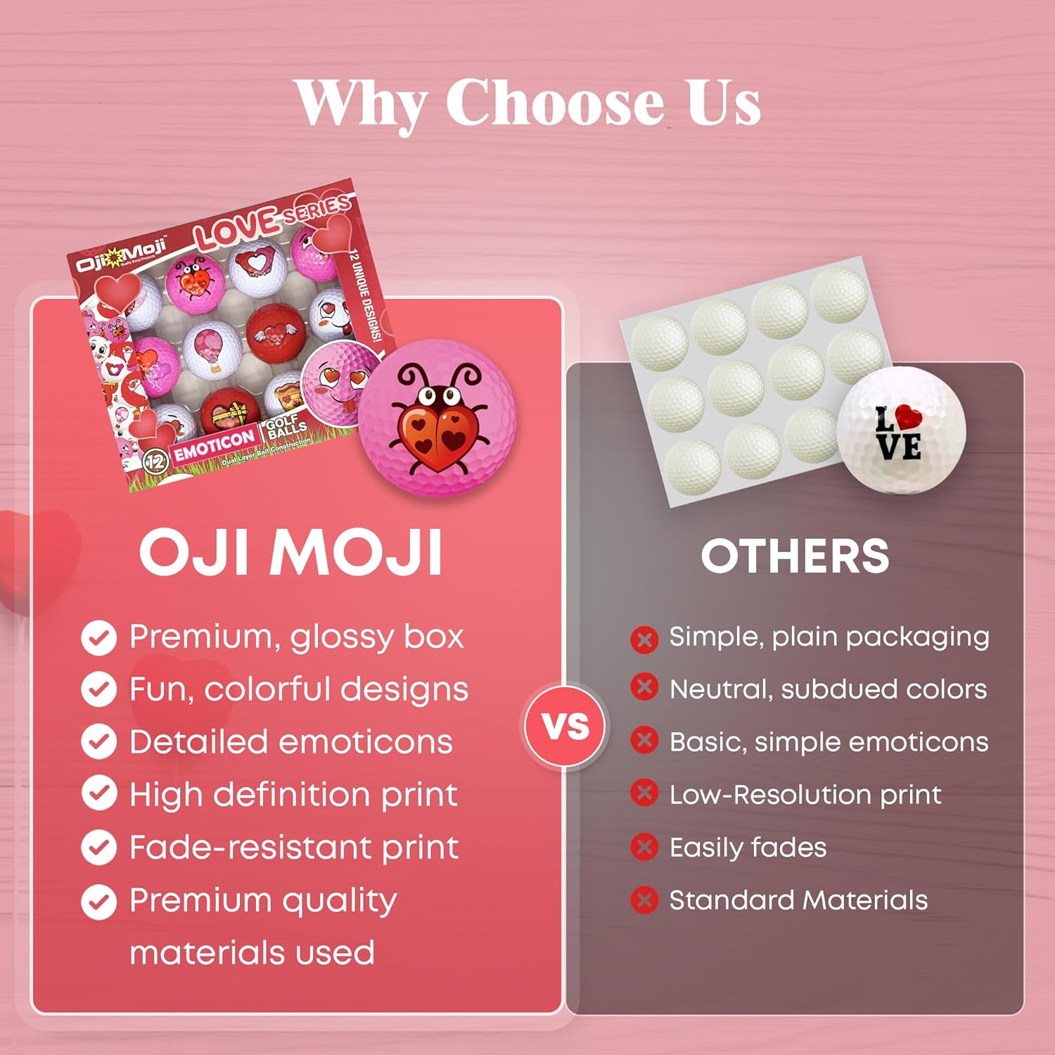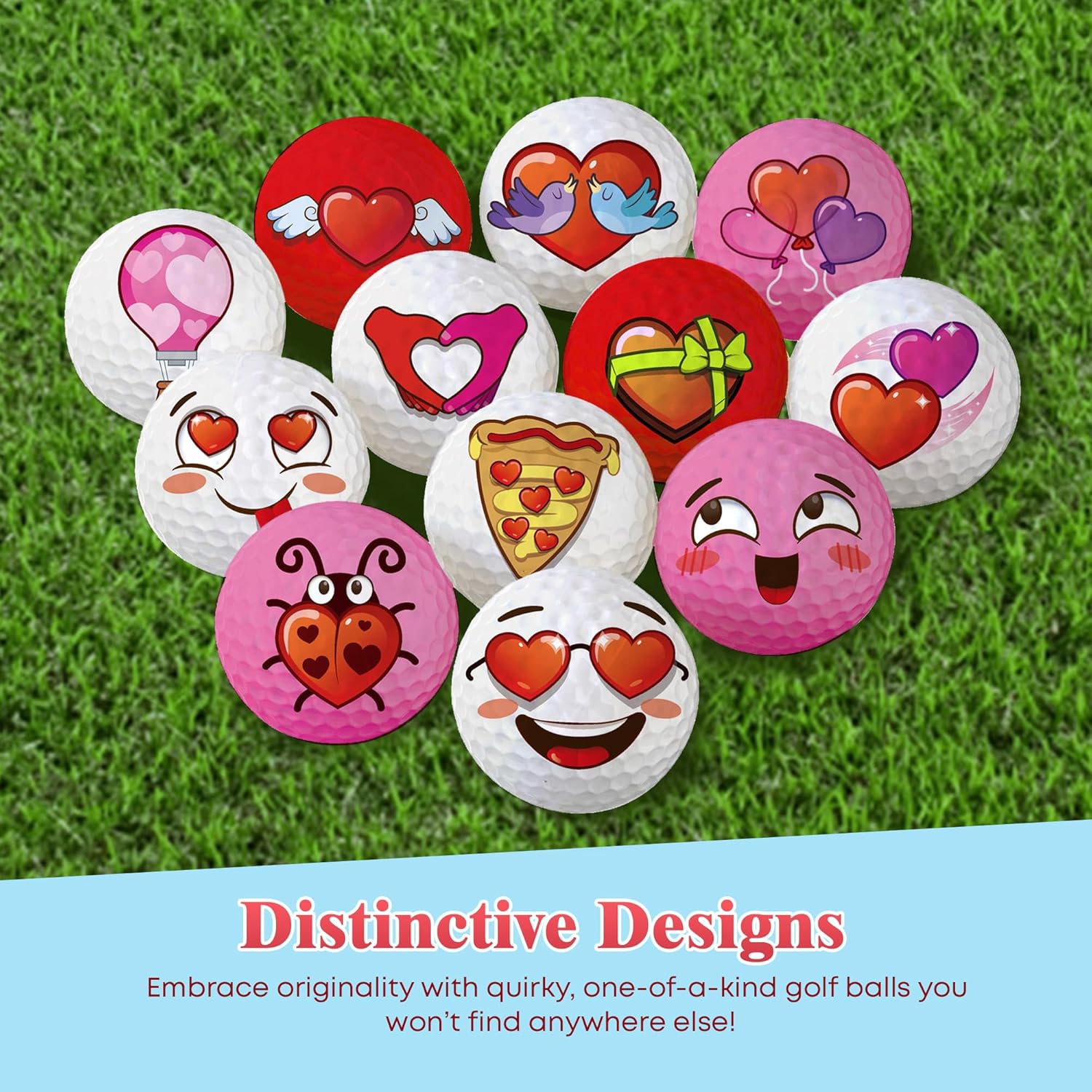 - 12 Unique Golf Balls - Get a 12-piece set of golf balls with designs and a unique theme, from heart-eyed smiles to love-struck pizza - OG designs that add a playful, heartfelt touch to any game!