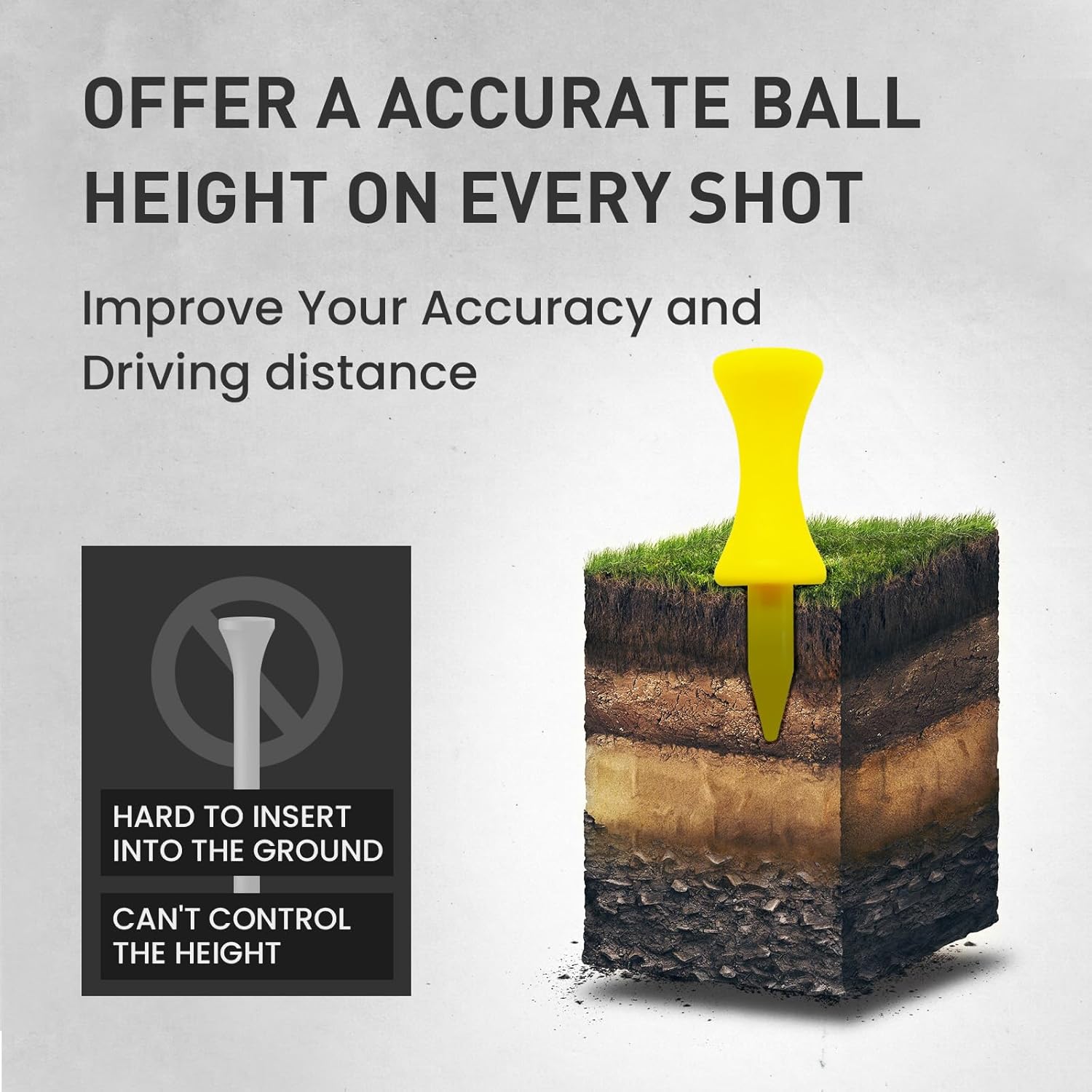 - Easy to Use: Easy to Push Into the Ground, Easy to Quickly Tee Up the Ball, Stable to Hold the Ball, and Won't Fall Off. Perfect for the Driver, Woods, and Irons to Get the Same Elevation on the Ball Time After Time.