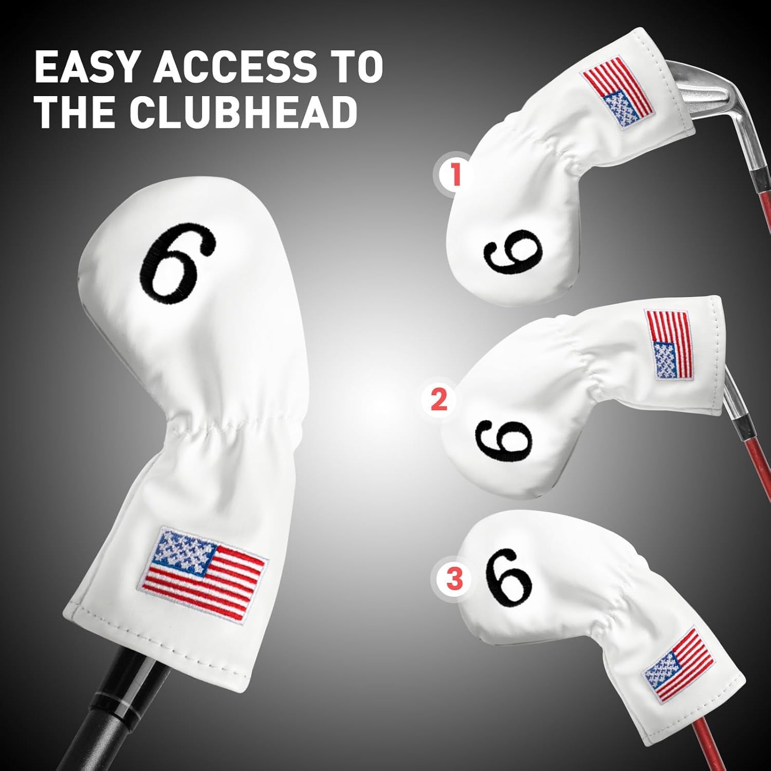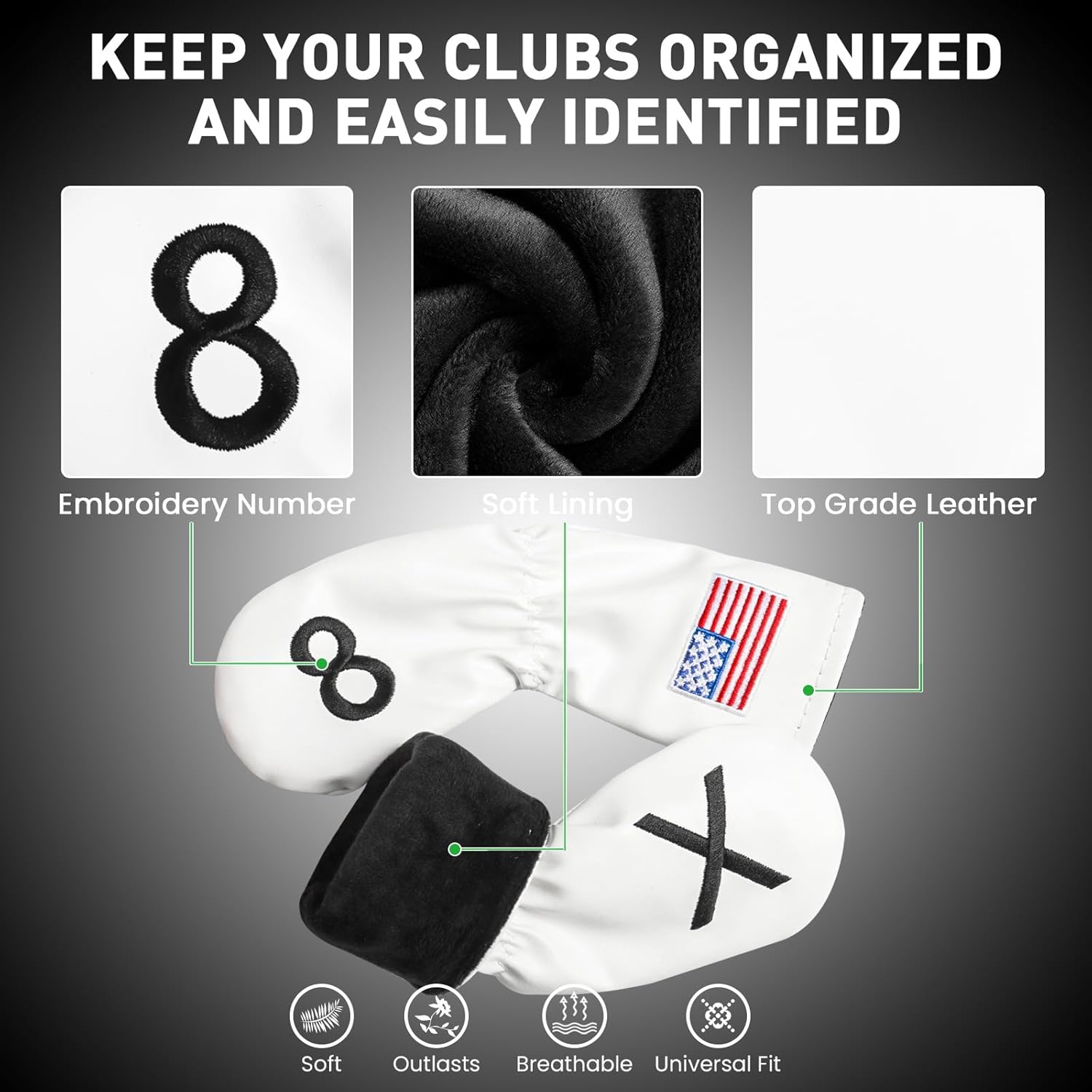 - Universal Fit & Organized Storage: Engineered with a universal fit system, these covers seamlessly accommodate every iron in your bag. The convenient storage design keeps your clubs neatly arranged, saving time during play.