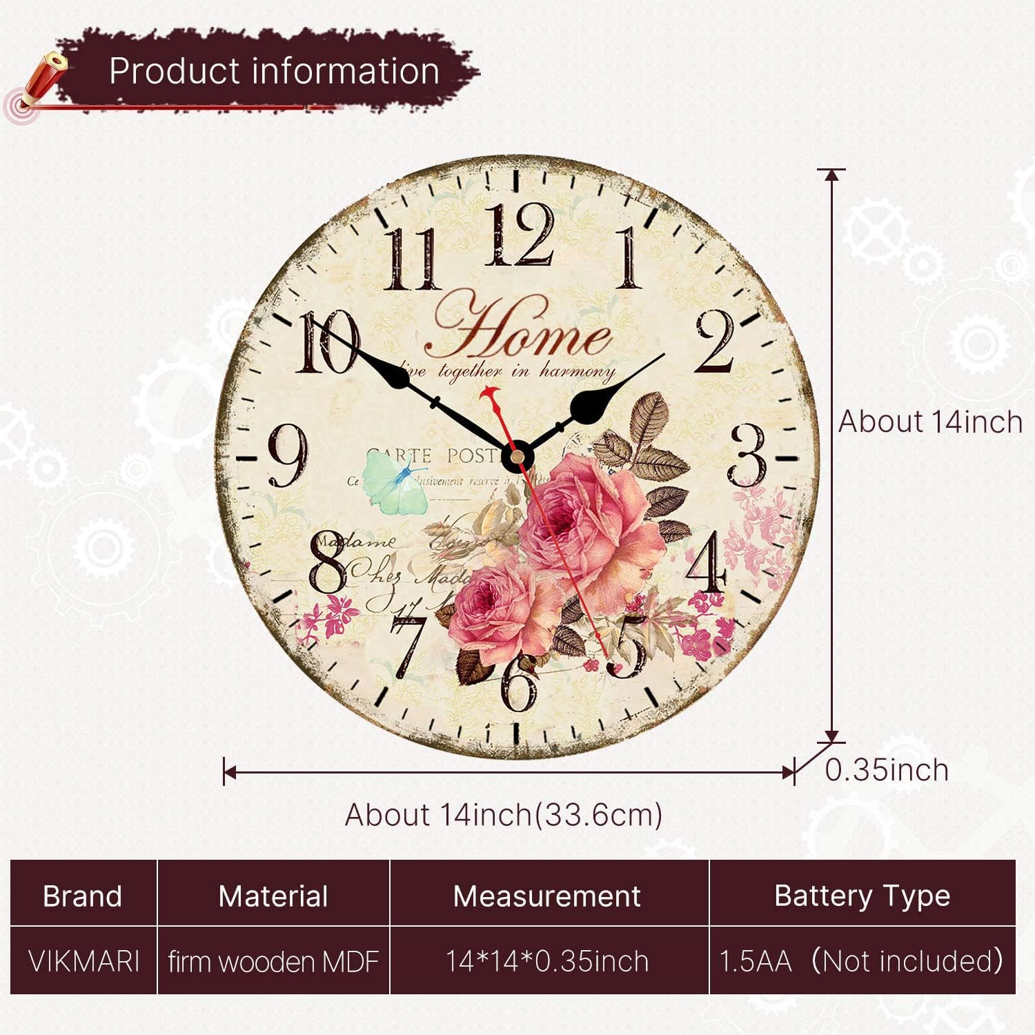 VIKMARI 14 Inch Wooden Wall Clock Art Hanging Clocks Silent Non-Ticking Wall Clock Battery Operated Round Home Flowers Style Arabic Numeral Decorative Wall Clocks