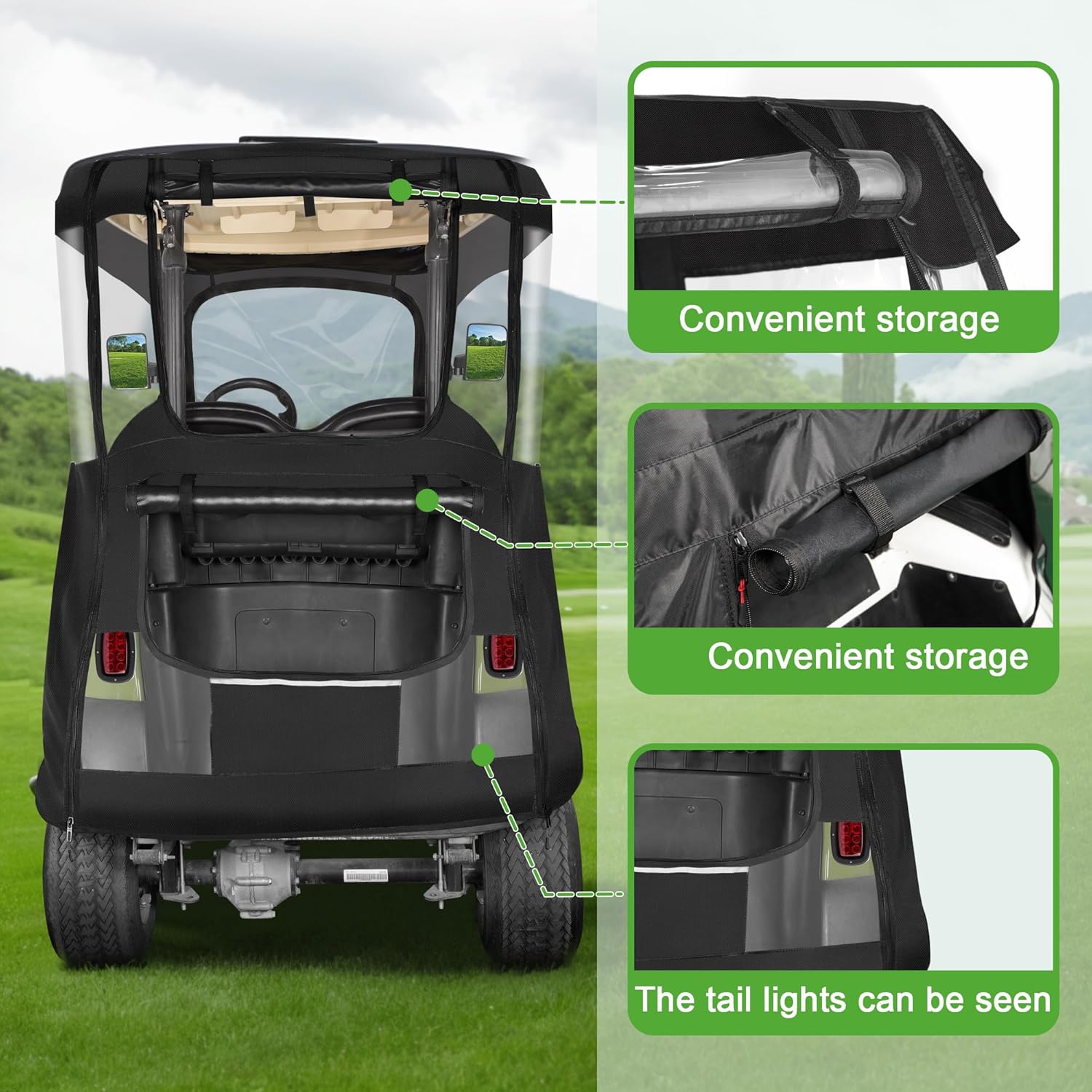 - Side doors and front rear windows can be zippered both inside and outside, roll up and easily fixed by magic tape, keep the golf cart ventilated and breathable