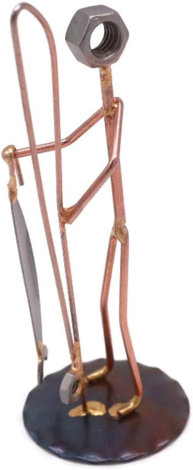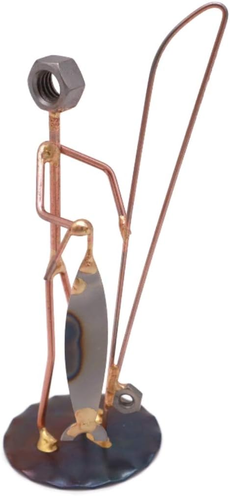 - FISHERMAN WITH FISH figure is crafted from nuts, brazing rods, washers, steel, and is great to use as a trophy or to accompany your business cards for a fun, eye-catching desk accessory. (The business cardholder may be purchased separately.) Approximately 2" wide by 6" tall.