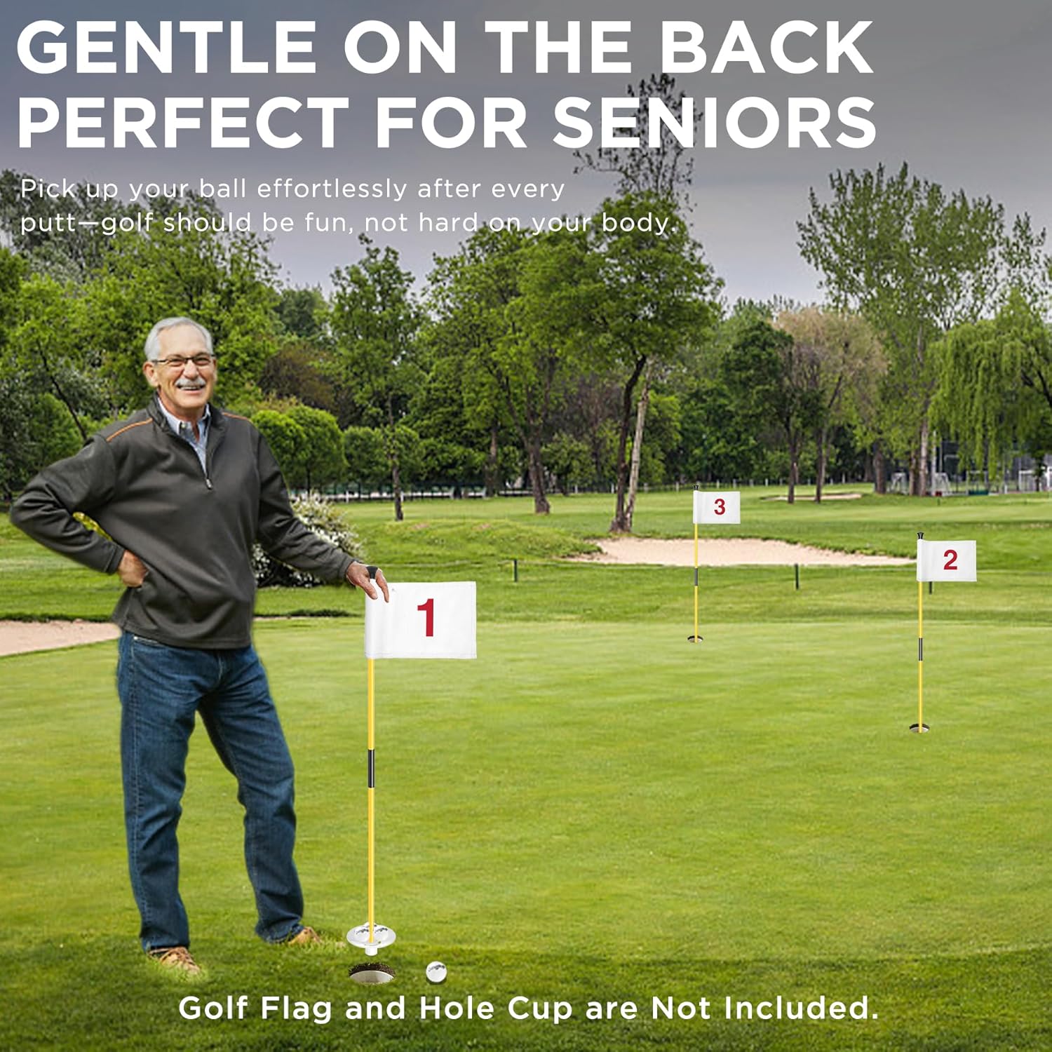 - UNIQUE- Flagpole designed with Ball Retriever, allowing golfers not bending down to pick up golf ball anymore, but just lift up the pole to get the balls.