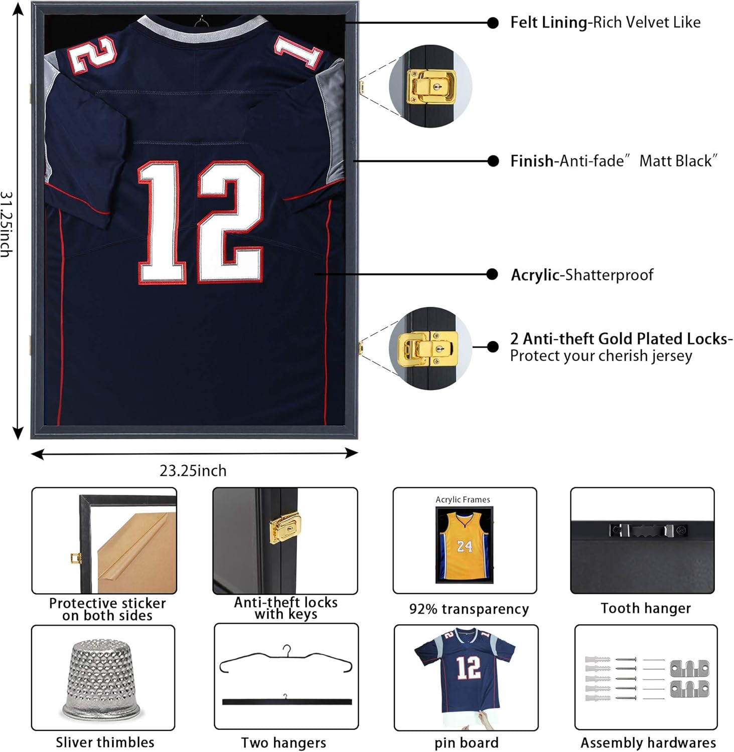 - PROTECT YOUR PRECIOUS JERSEY - The shatter proof acrylic board features in UV protection and high transparency, which protects your jersey from fading and keeps out dust. One pair of gold plated and anti-theft locks on the frame provide extra protection. They will not turn yellow over time.