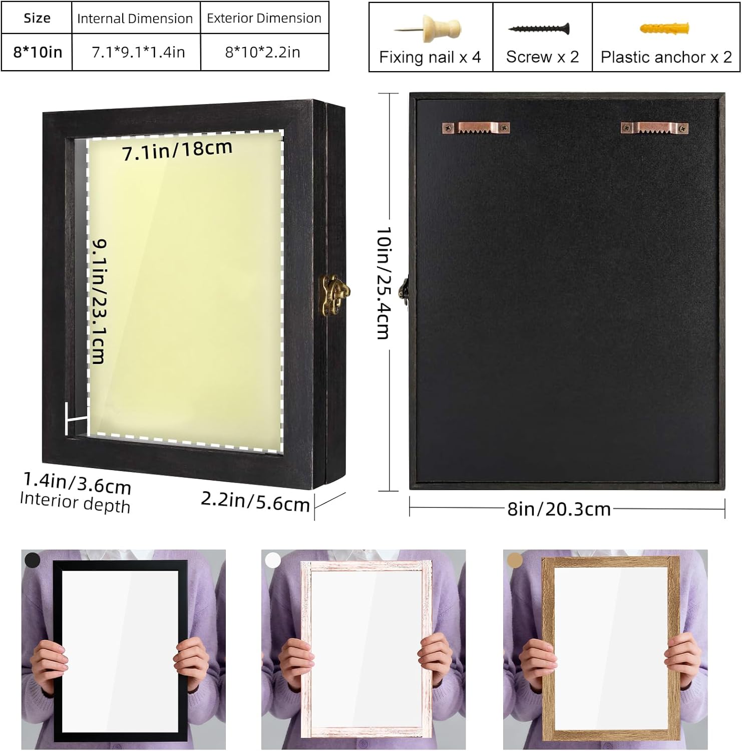 - High-Quality Materials – The shadow box inside dimension is 7.1'' x 9.1'' x 1.43'' (depth) and the outside is 8” x 10”, comes with a solid, durable wood frame, woven fabric interior with 4 stick pins, hasp horn lock door with a transparent shatterproof glass window, and two metal sawtooth hanging hooks on its back.