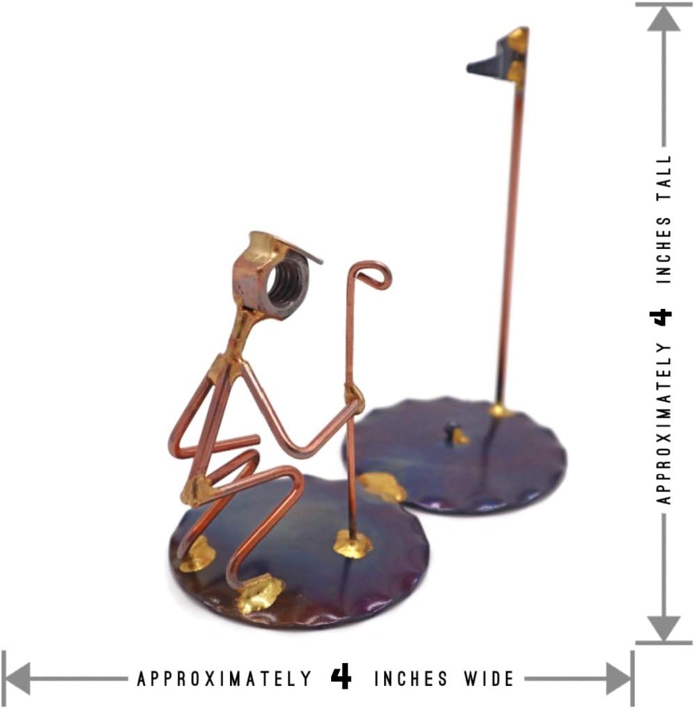 - GOLF SHORT PUTT MAN figure is crafted from nuts, brazing rods, washers, steel, and is great to use as a trophy or to accompany your business cards for a fun, eye-catching desk accessory. (The business cardholder may be purchased separately.) Approximately 4″ wide by 4″ tall.