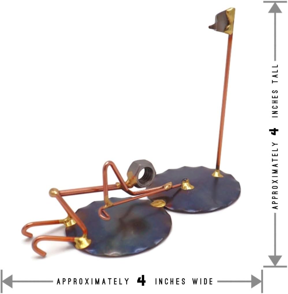 - GOLF POOL SHOT IN figure is crafted from nuts, brazing rods, washers, steel, and is great to use as a trophy or to accompany your business cards for a fun, eye-catching desk accessory. (The business cardholder may be purchased separately.) Approximately 4″ wide by 4″ tall.