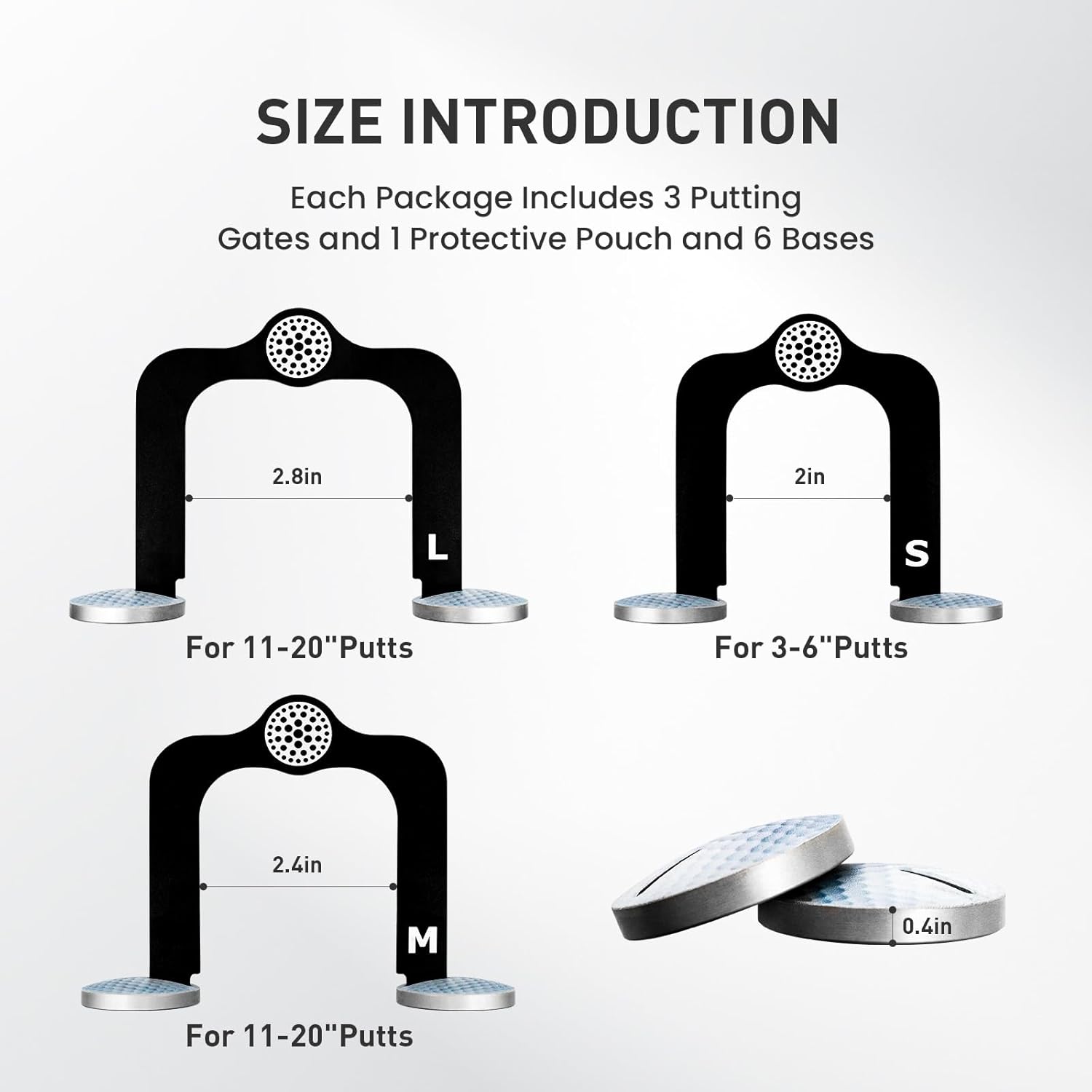 - High Quality Golf Putting Gates: Made Of High Quality Aluminum Alloy. It Is A Great Product That Is Rust Proof, Durable, Tough And Not Easily Deformed. The Set Includes 3 Putting Gates Of Different Sizes: Small(1.97 Inches), Medium(2.36 Inches) And Large(2.75 Inches). Coming With A Protective Pouch And 6 Bases.