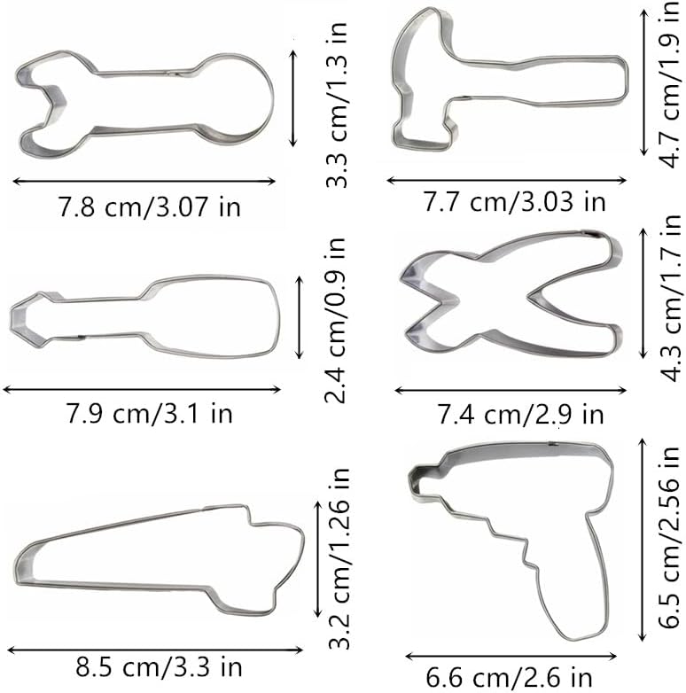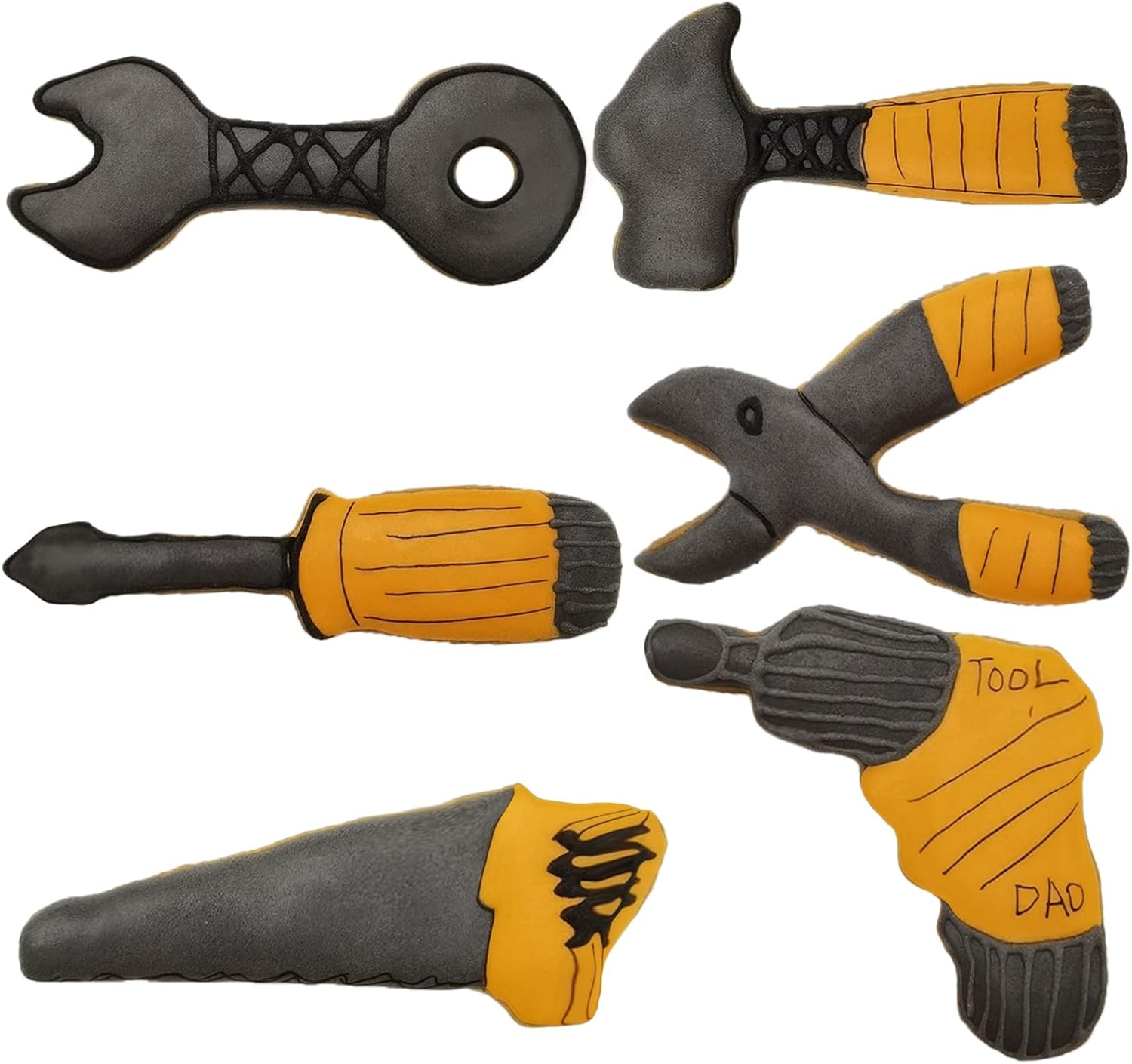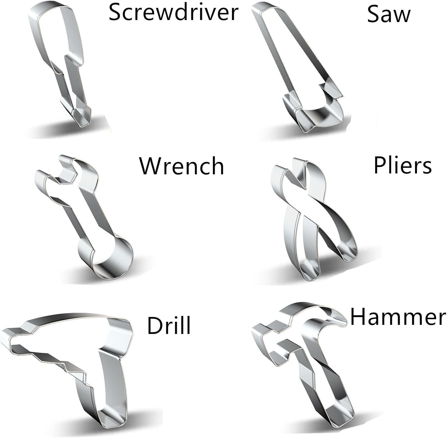 - ★【6 PCS OF MINI CONSTRUCTION HANDWARE TOOLS SHAPED COOKIE CUTTER SET】 - Stainless steel cookie DIY molds set, 6 different mini construction tools shapes cookie cutting molds:saw, hammer, wrench, screwdriver, pliers, drill. Have fun to making cookie for Father's day with families together.