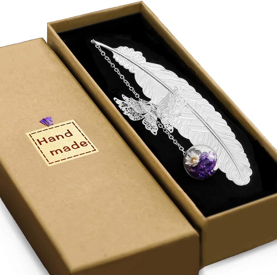 - Uniquely Designed vintage metal feather bookmarks. Featuring a realistic 3D metal butterfly pendant and eternal dried flower glass bead charm. Motivates you to read and is a cheerful topic-starter for all ages and tastes.