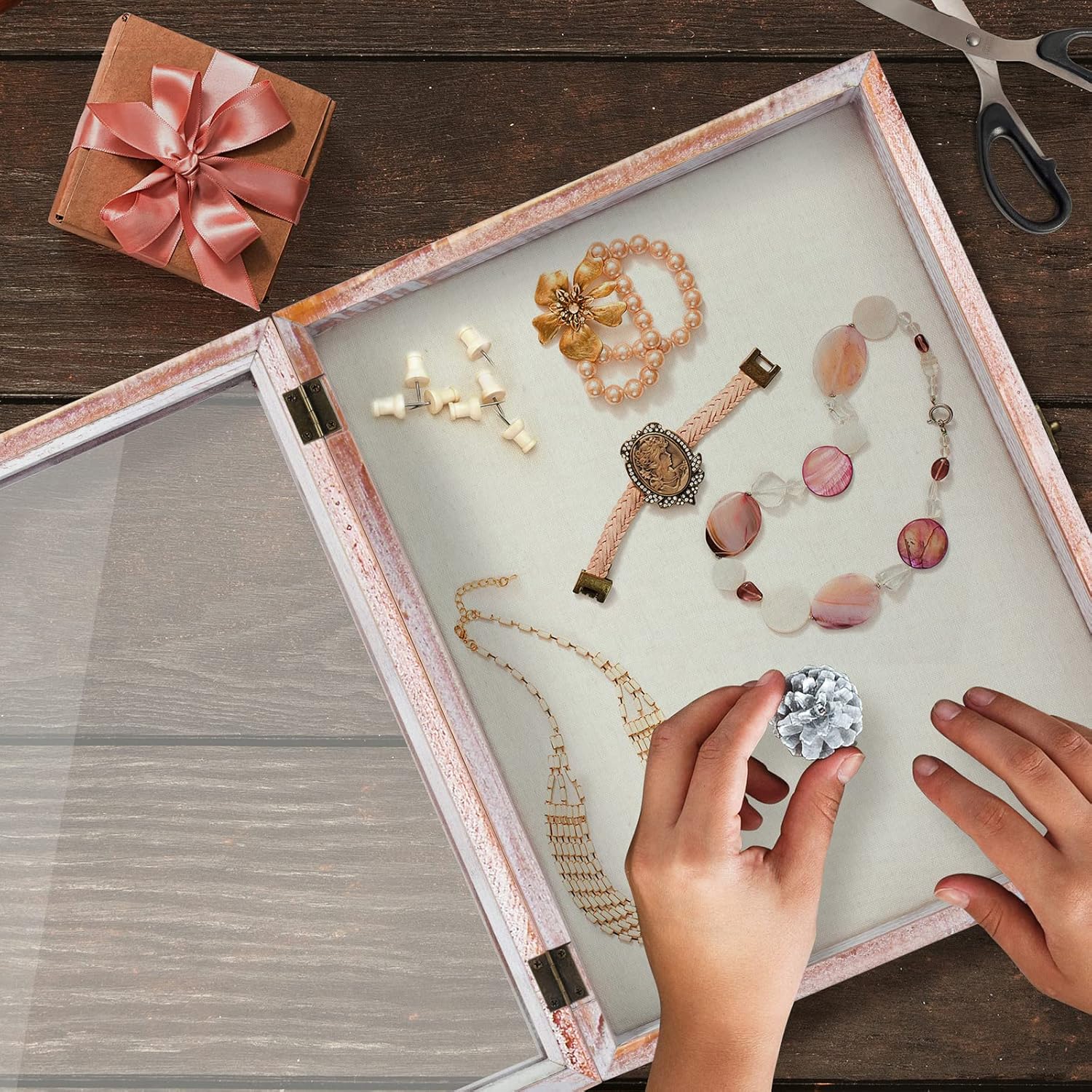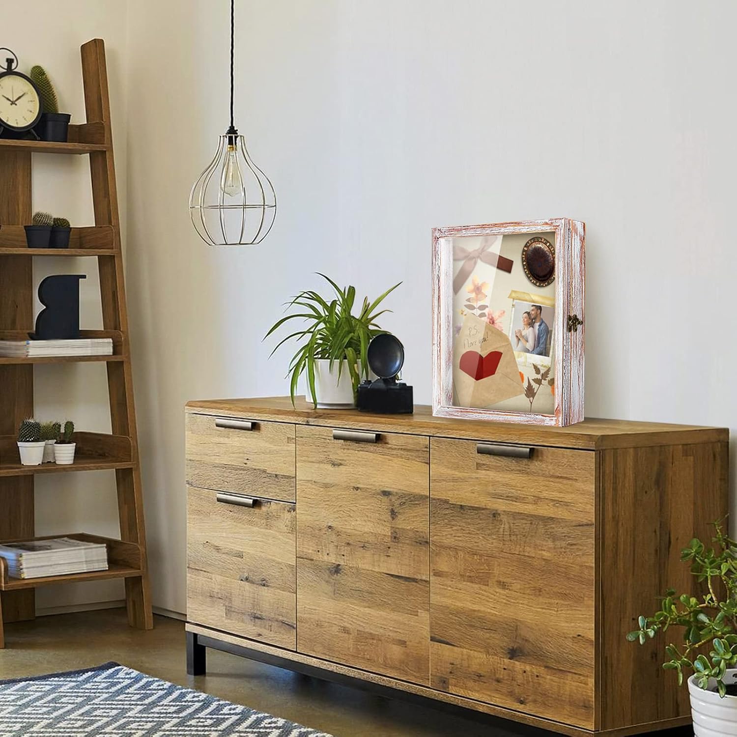 - Hinged Door - The front display door makes it easy to place or exchange items inside. The retro horn lock makes the shadow box lockable and more secure, and prevents the items inside from falling out.