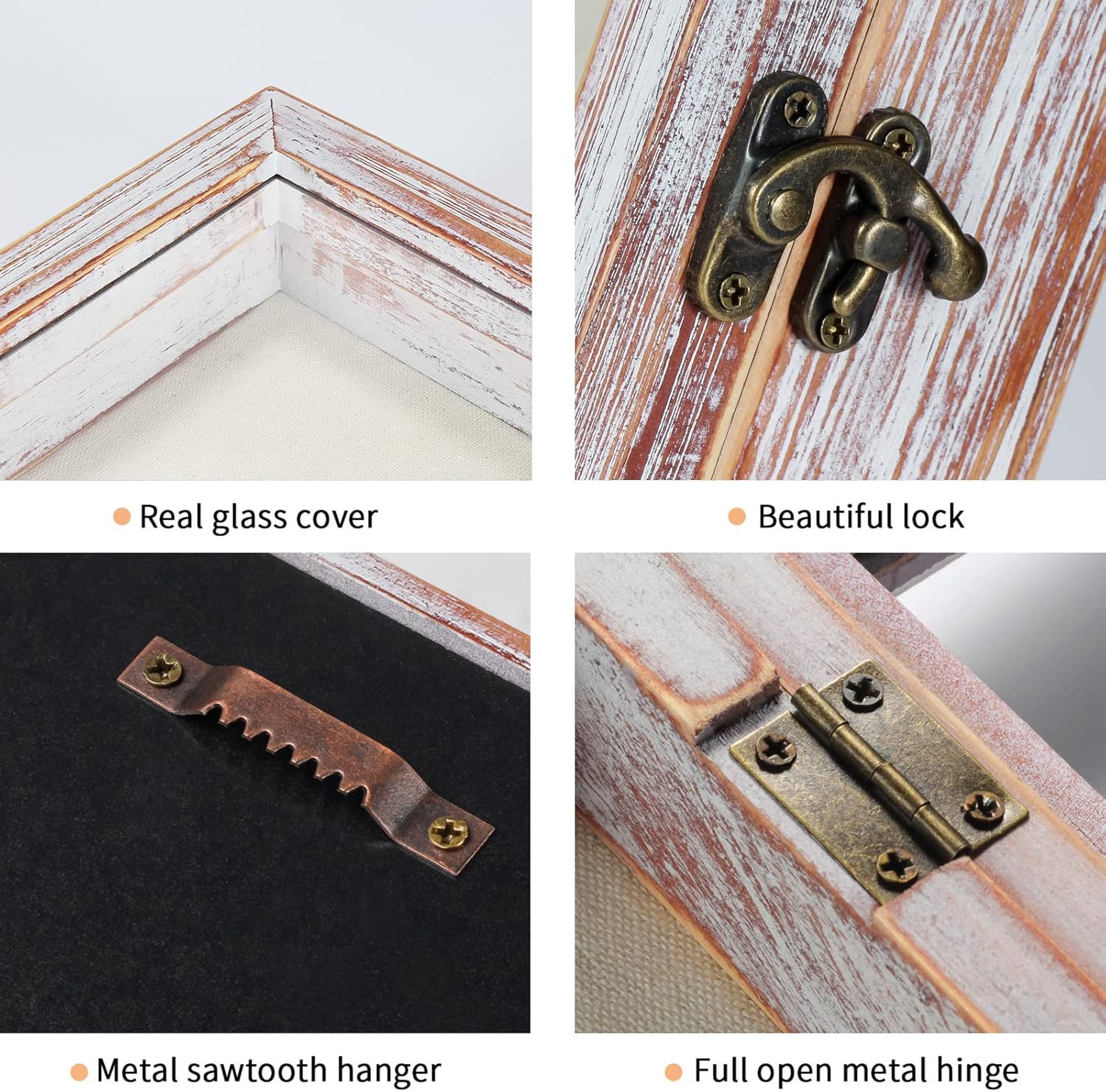 - High-Quality Materials – The shadow box inside dimension is 10'' x 13.1'' x 1.82'' (depth) and the outside is 11” x 14”, comes with a solid, durable wood frame, woven fabric interior with 8 stick pins, hasp horn lock door with a transparent shatterproof glass window, and two metal sawtooth hanging hooks on its back.