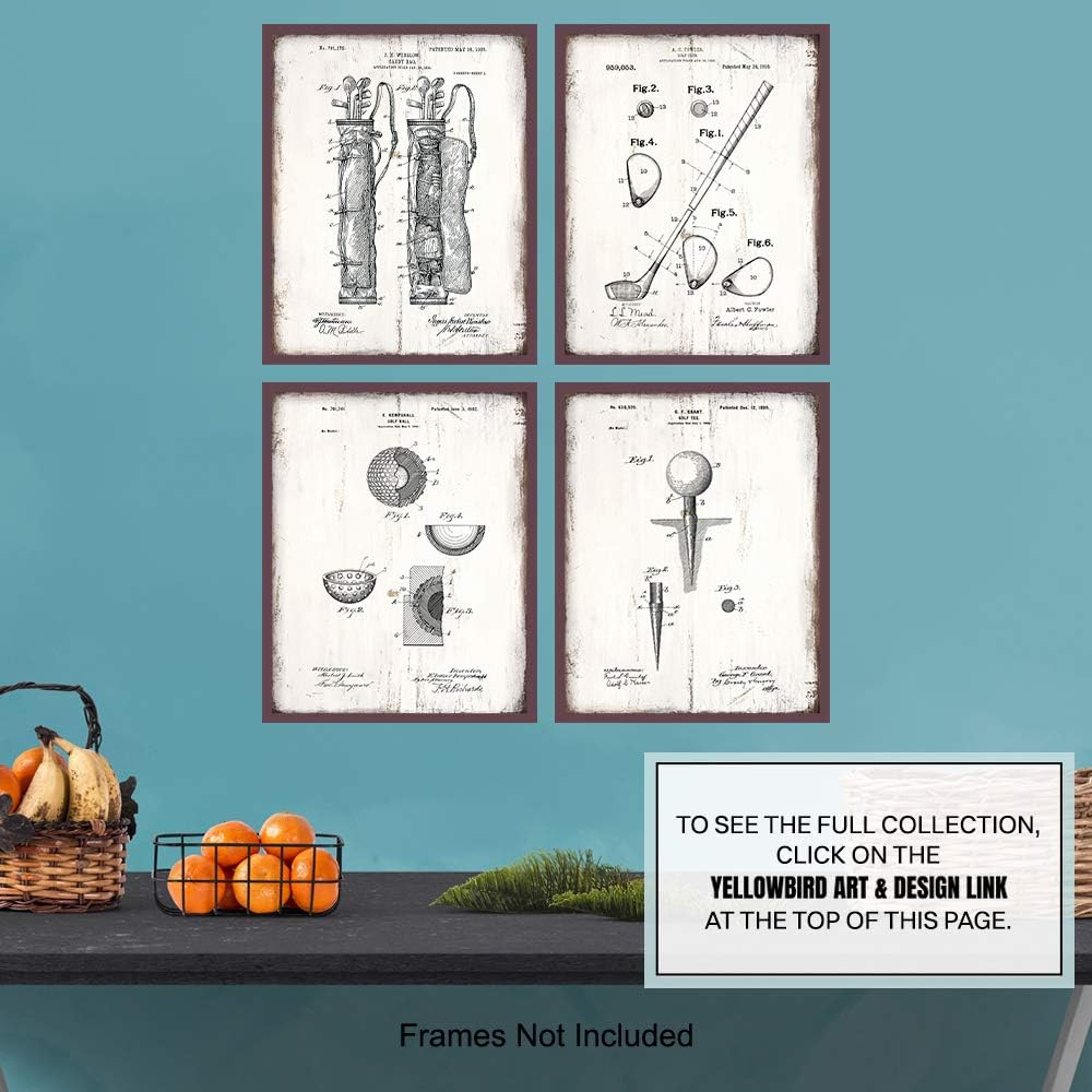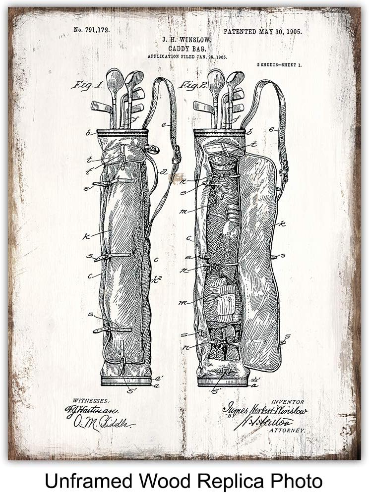 Golf Balls, Clubs, Tees, Bags Patent Print Wall Art - Rustic Room Decor for Office, Man Cave, Den, Living Room - Gift for Men, Teens, Guys, Golfing Sports Fan, Golfer - Sign Print Photo Plaque Set