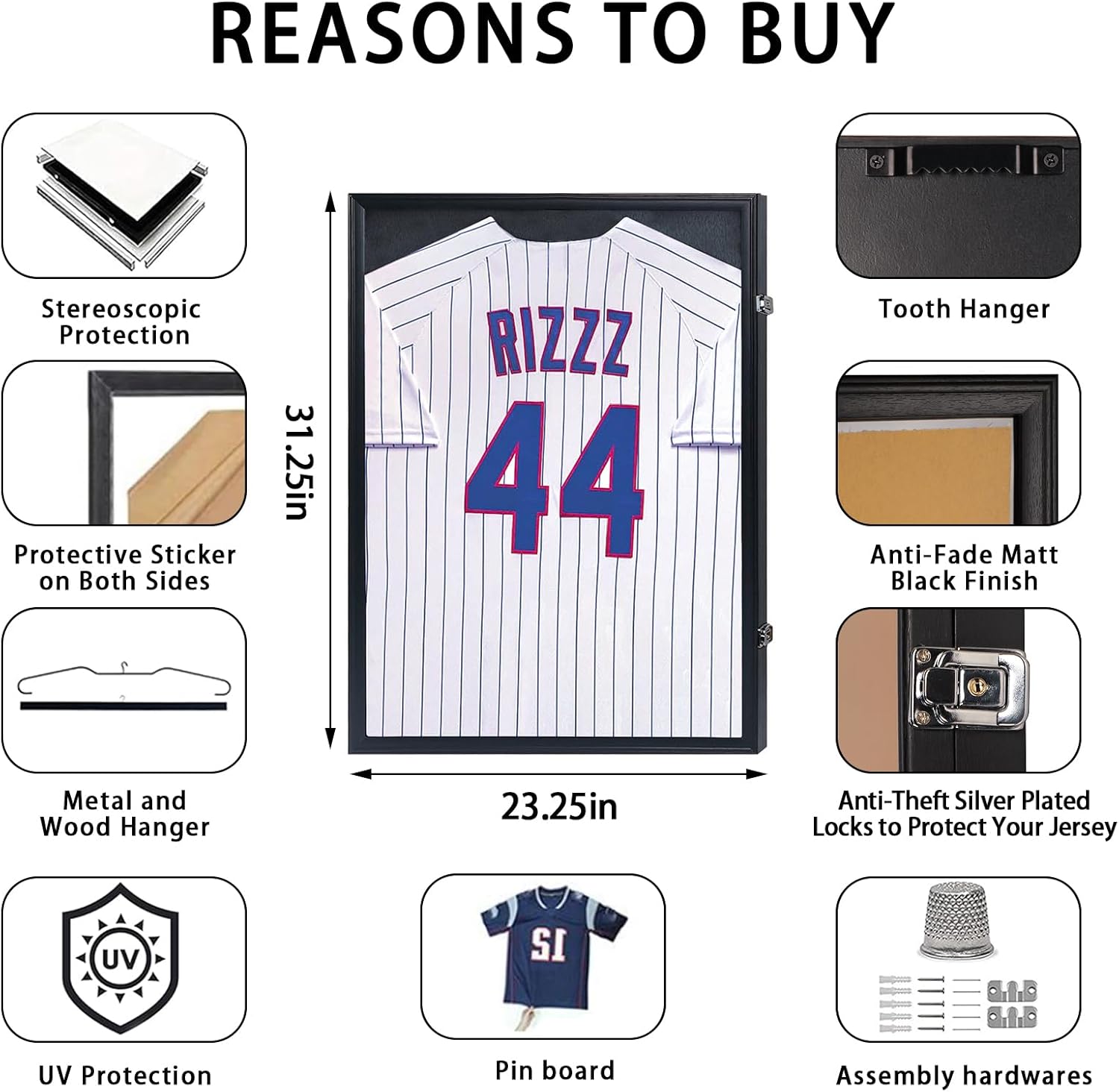 - HIGH QUALITY WITH RELIABLE FEATURES - Made out of wood with Anti-fade Matt Black finish, IHEIPYE Jersey Frame is durable enough for a long-lasting working life. Shatter Proof transparency and UV protection acrylic glass panel, two Silver plated anti-theft locks can well protect your cherished sports memorabilia or collectibles. Customer-friendly accessories and visual user manual are packed all together with our sincere service!