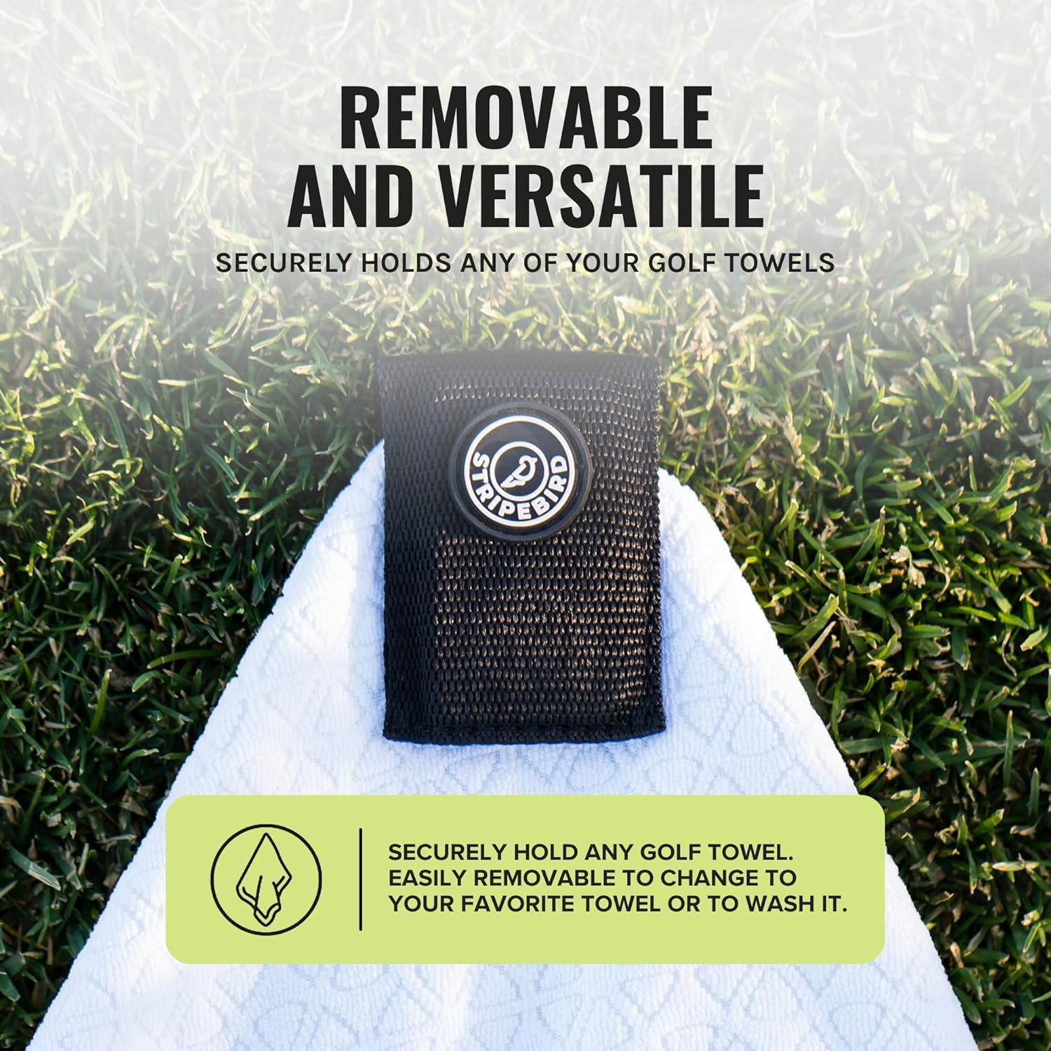 - COMPATIBLE WITH ANY TOWEL AND REMOVABLE: The Stripebird Magnetic Towel Clip is easily removable and can be used on any towel that you use. You can clip it onto any towel if you choose to change towels or to wash it. Attaches to golf bag magnet.