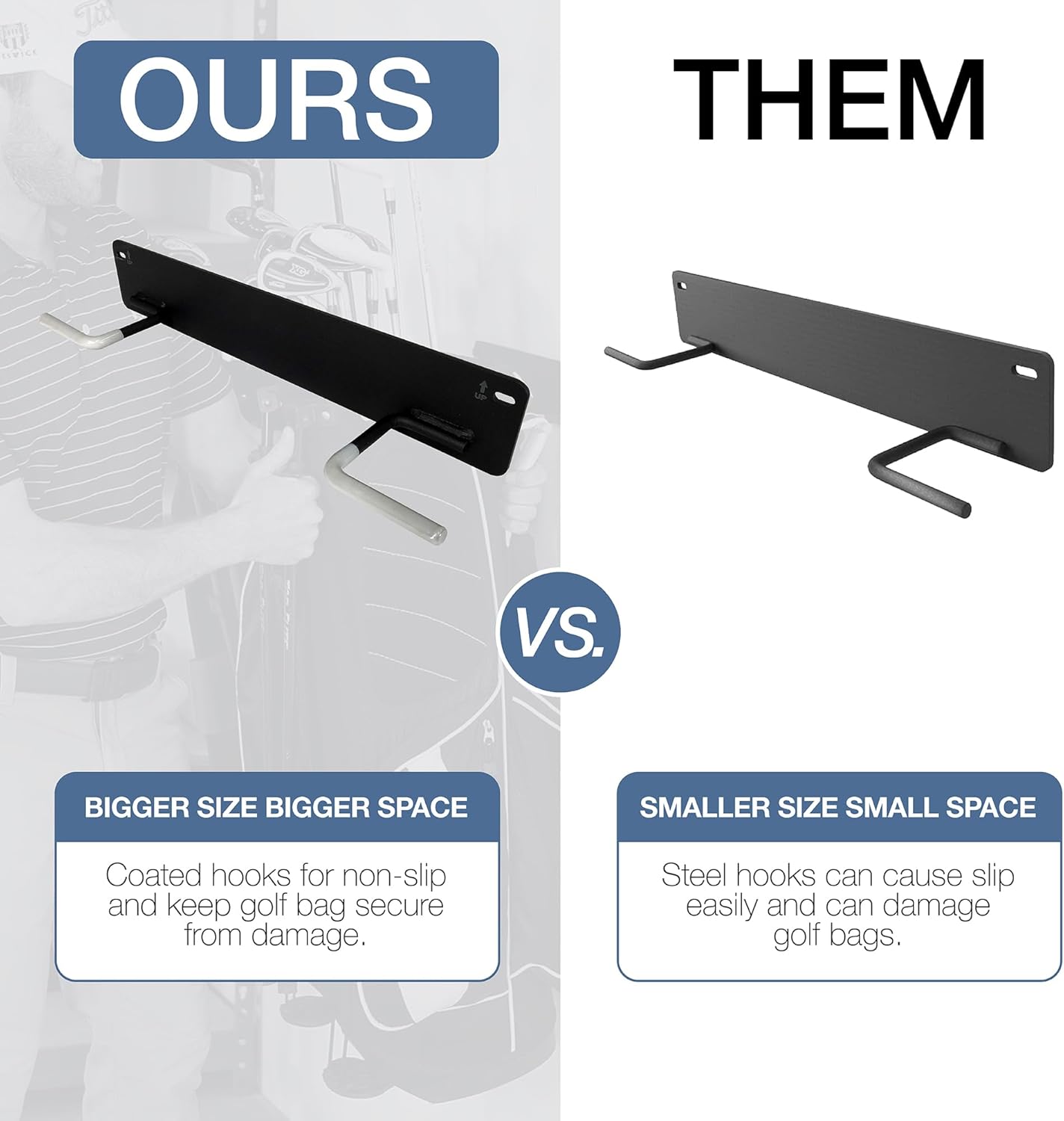 - Fits 2 Golf Bags Securely – Equipped with two golf bag garage hooks, each spaced 10.5 inches apart, making it compatible with most golf bags, stand bags, and cart bags.